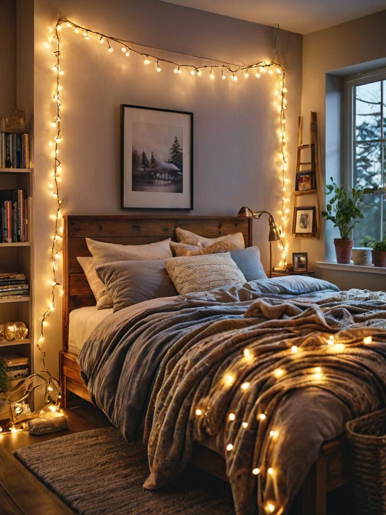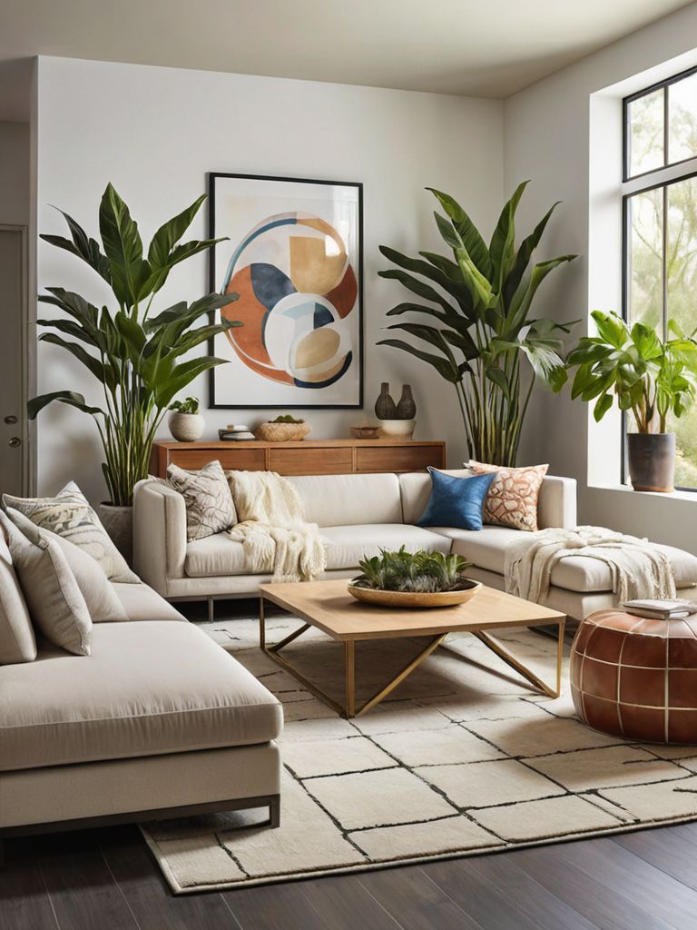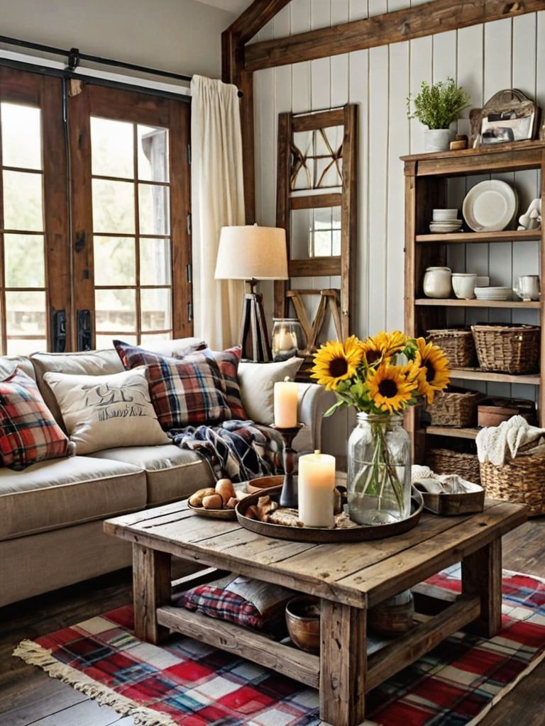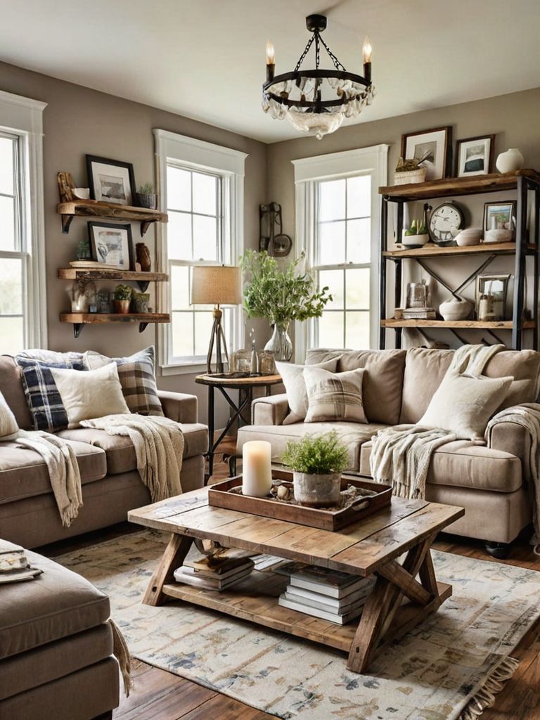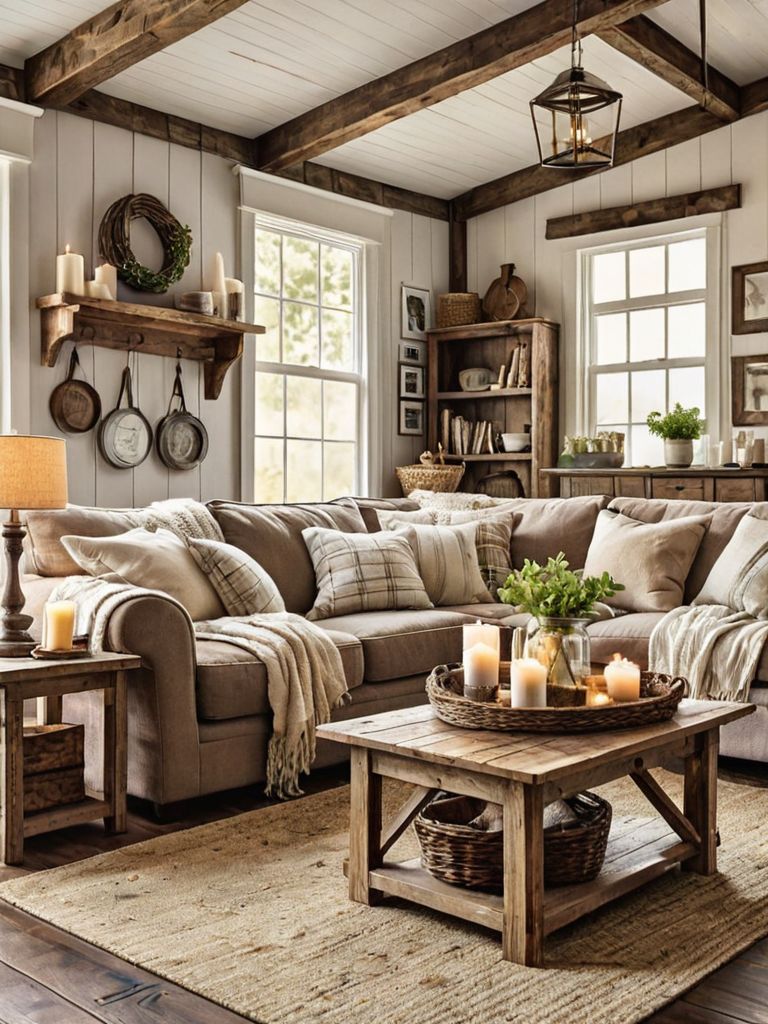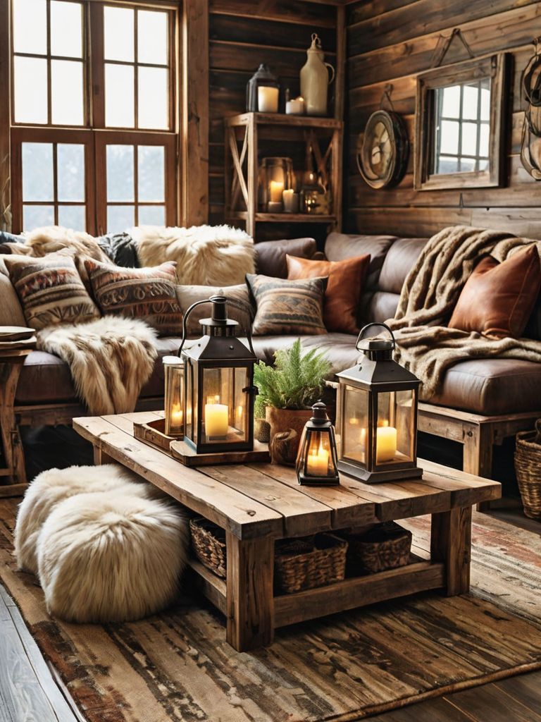 Distressed wooden coffee table, Cozy throw blankets, Neutral color palette wall paint, Rustic farmhouse style area rug, Vintage lanterns for lightingDescription