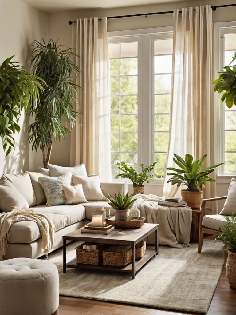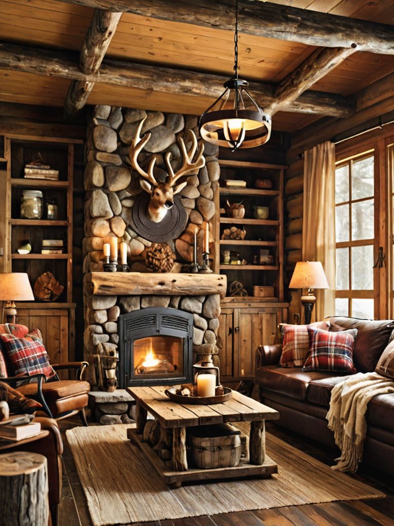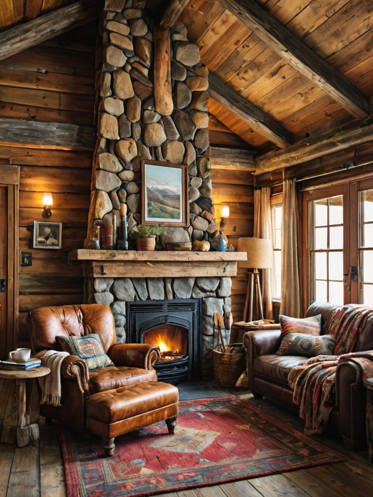 Wooden furniture, Stone accents, Woven textures, Warm lighting, Vintage accessoriesDescription
