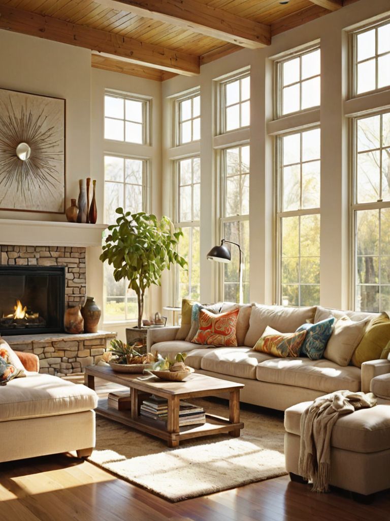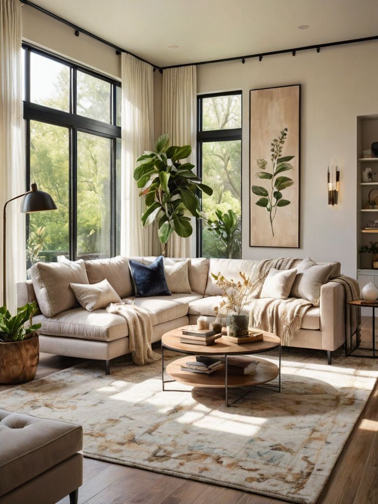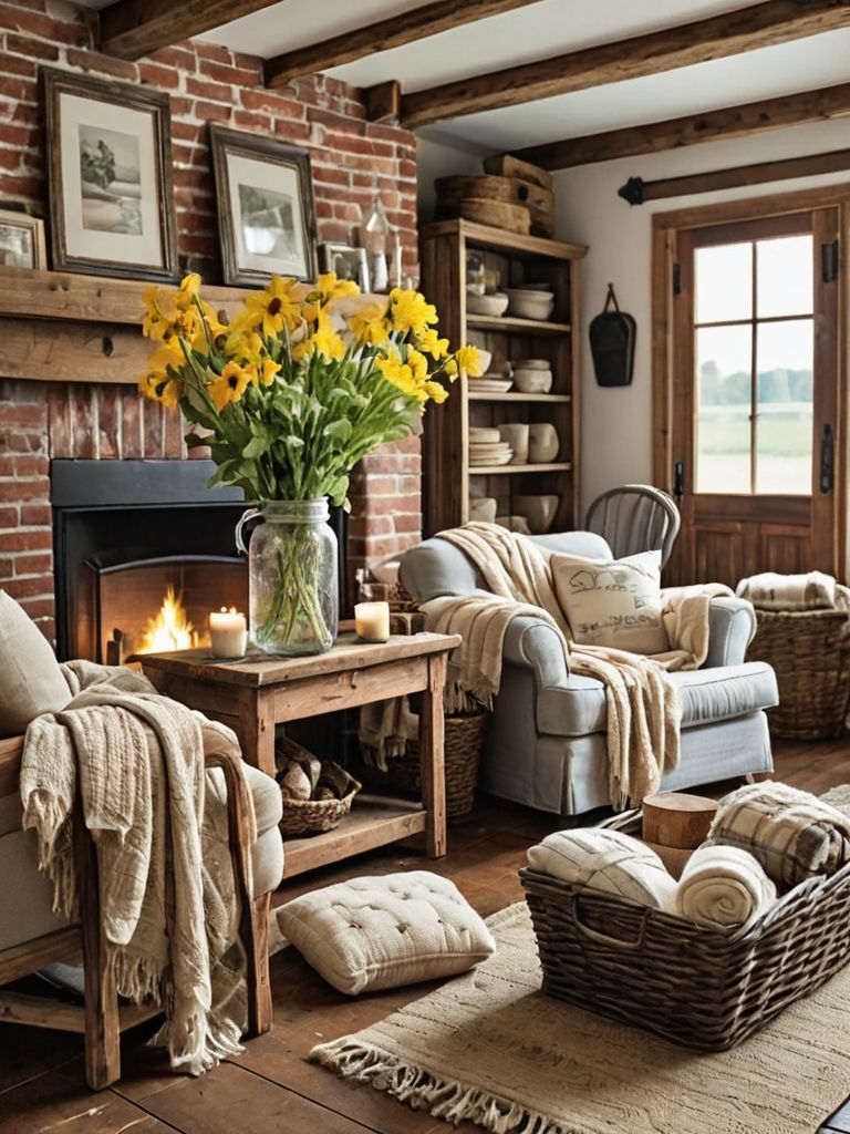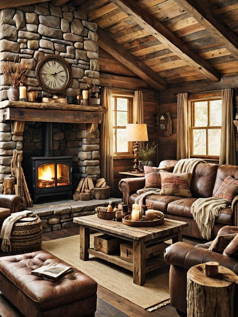 Rustic Elegance: Transform your living space into a cozy haven with a blend of natural elements and sophisticated touches. Begin by incorporating distressed wooden furniture, complemented by plush ivory upholstery and luxurious fur throws. Accentuate the room with rustic wall art, vintage candle holders, and an array of potted plants, creating a serene and timeless ambiance.