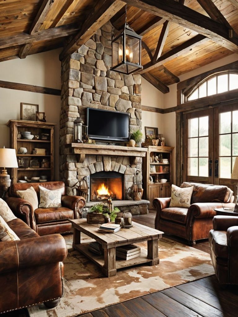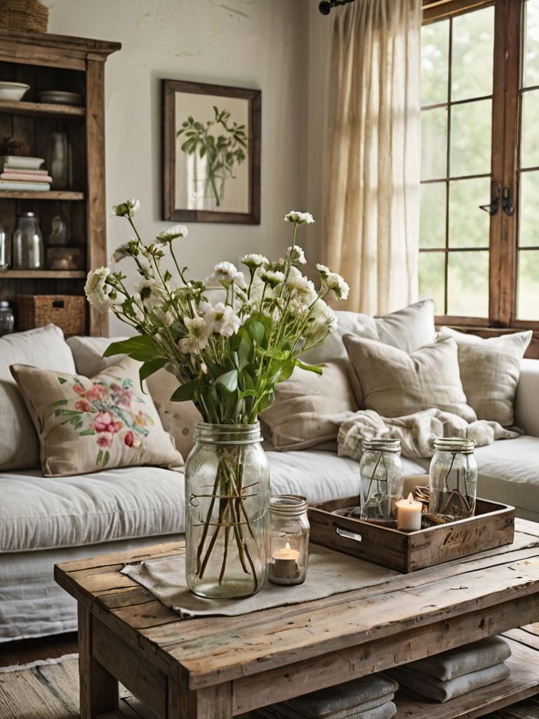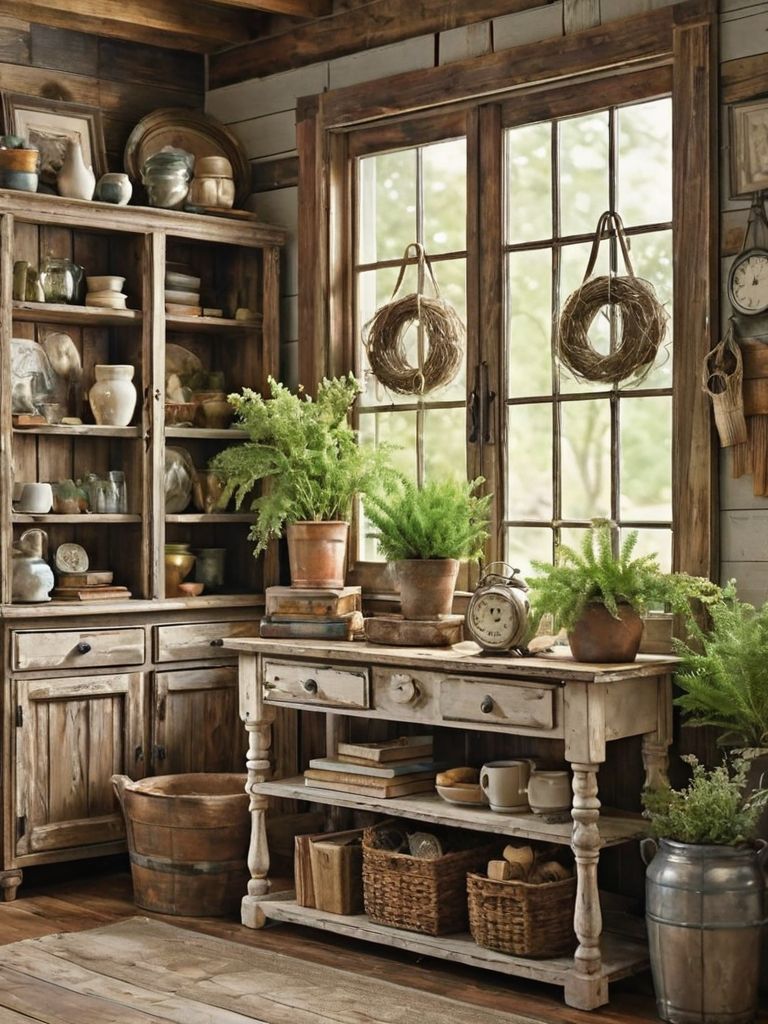 Reclaimed wood accents, Vintage metal accents, Mason jar lighting, Handcrafted barn doors, Distressed furnitureDescription