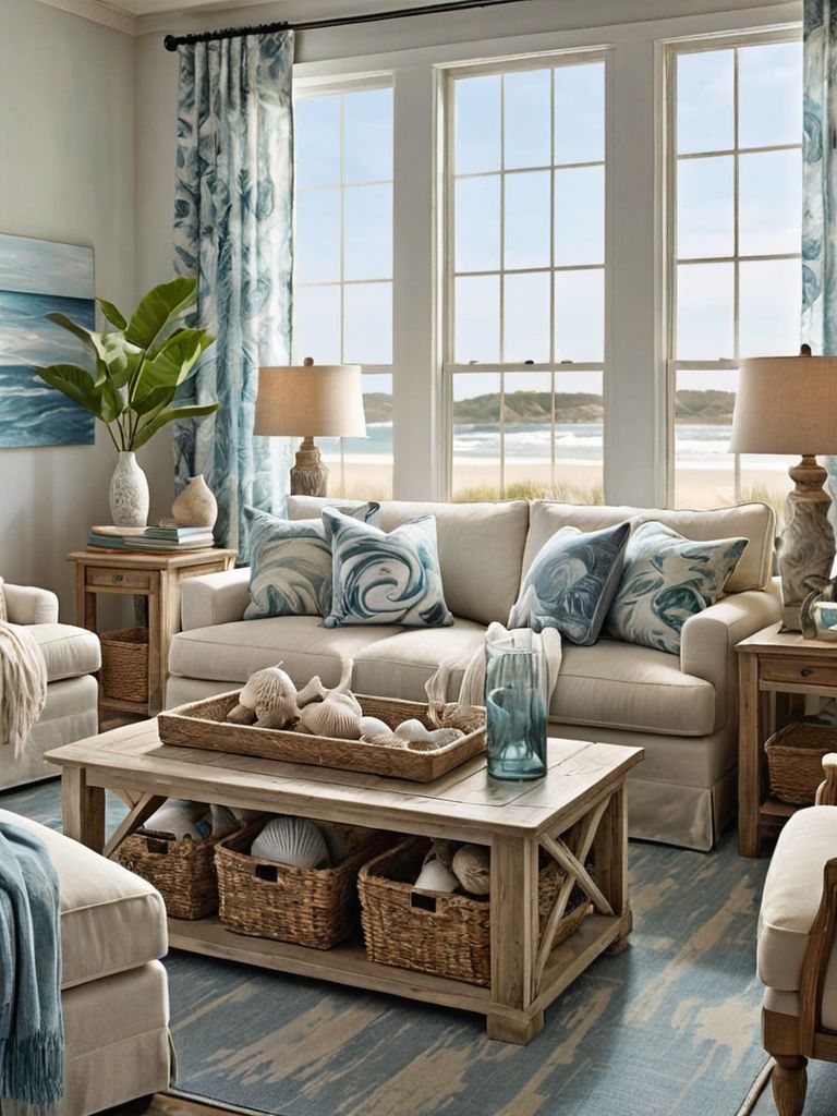 Bamboo blinds, Tropical leaf-patterned rug, Wicker furniture, Plush cushions in palm green and sandy beige, Potted palmsDescription