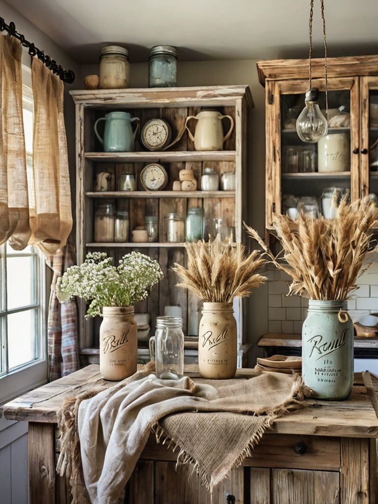 Vintage rugs, Handcrafted pottery, Wooden furniture, Earthy-toned home decor, Cozy cottage-inspired accentsDescription