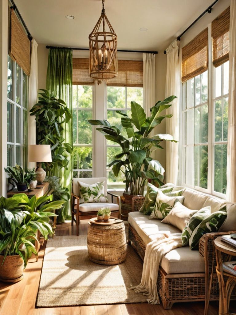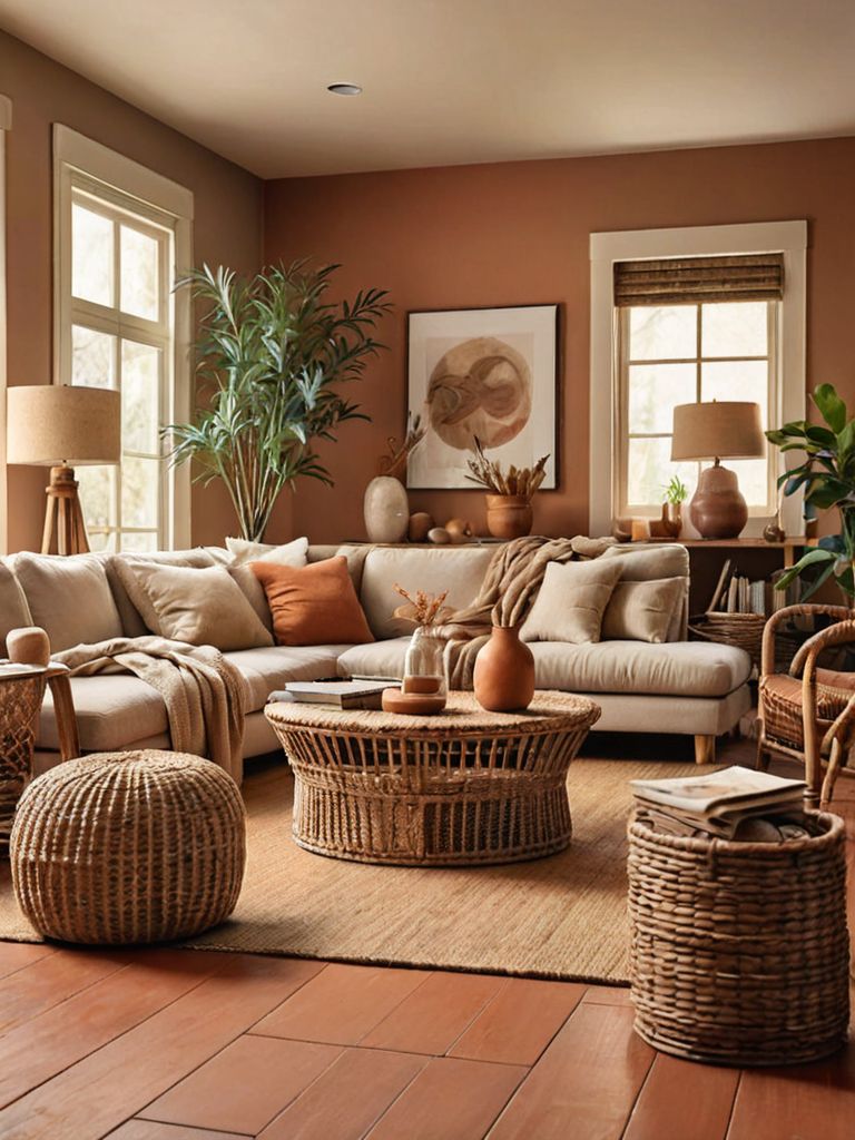 Rustic Haven: Picture a charming cottage nestled within a serene forest, surrounded by towering pine trees and the gentle hum of nature. Inside, warm, earthy tones create a cozy atmosphere, complemented by wooden furniture and accents, vintage rugs, and handcrafted pottery. Embrace the rustic charm and create a haven that breathes tranquility and invites you to unwind in its natural beauty.