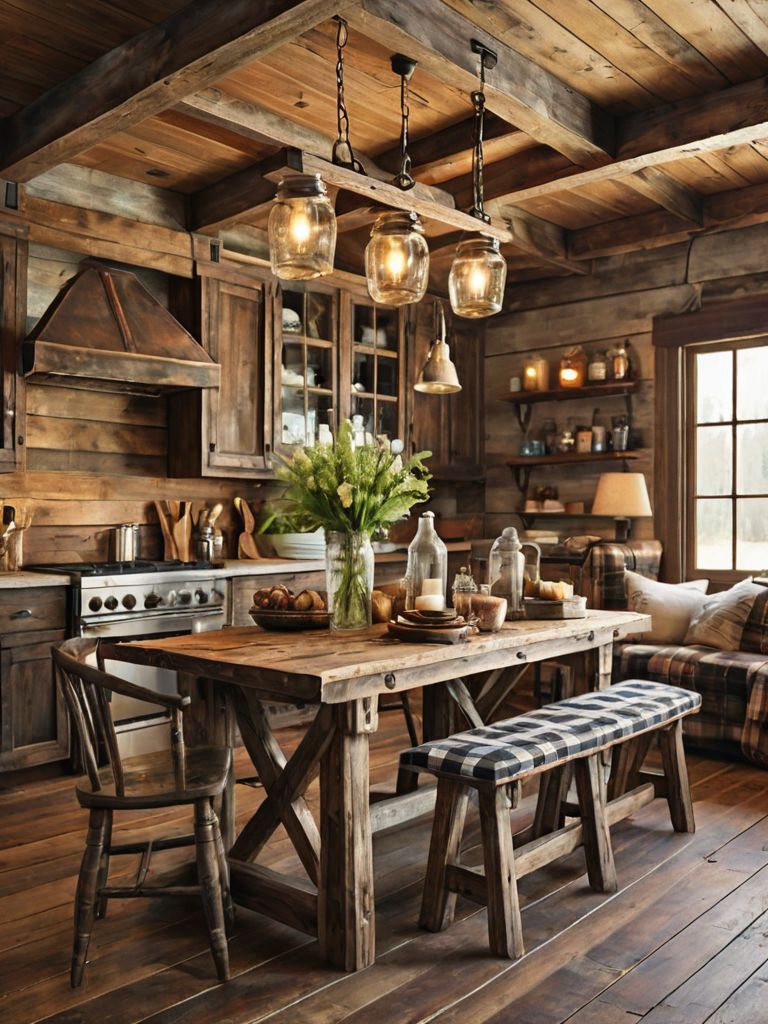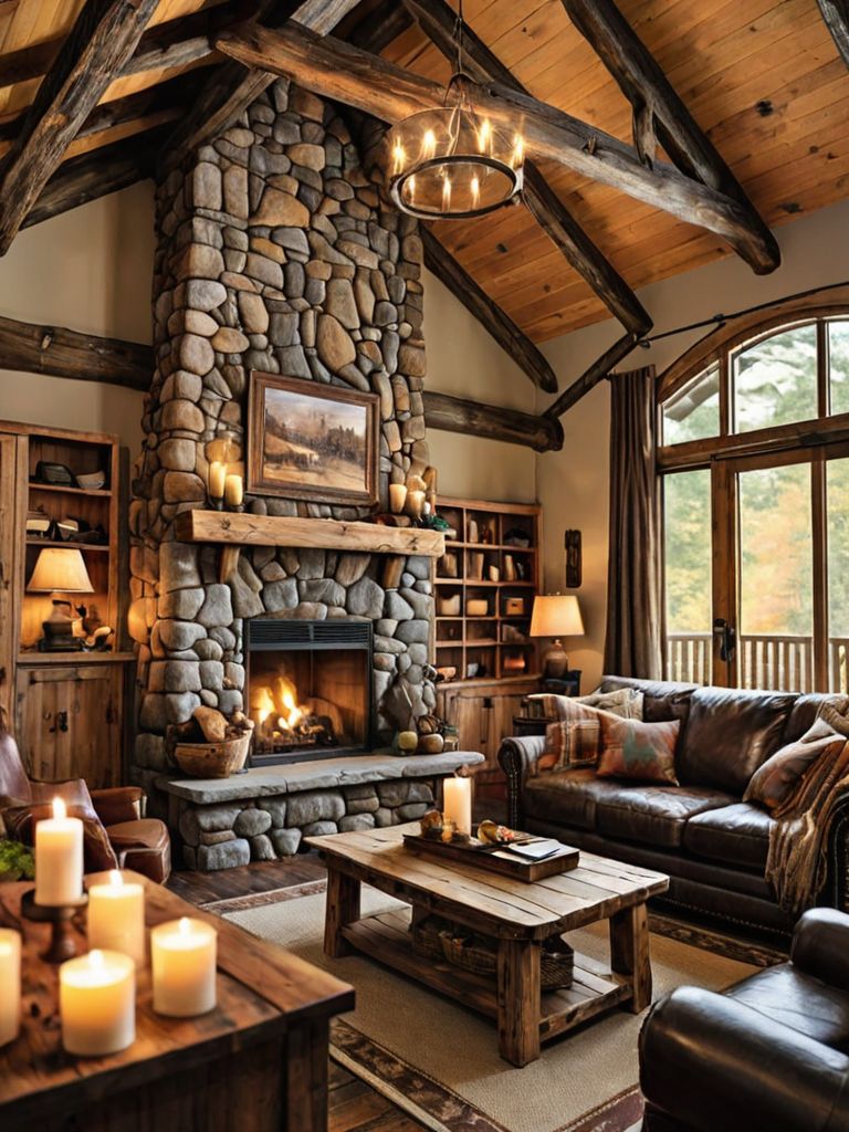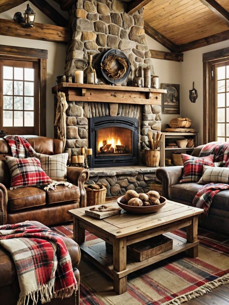 Reclaimed wood coffee table, Faux fur throw, Vintage lanterns, Wood paneling, FireplaceDescription