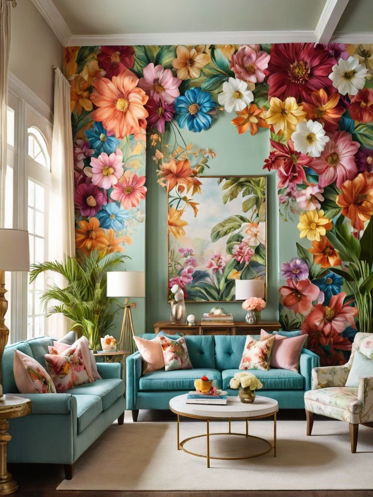 Paisley Paradise: Transform your living room into a cozy and vibrant space with a blend of paisley patterns, lush textiles, and earthy colors. Picture a large paisley-printed rug in warm tones beneath a plush velvet sofa adorned with an array of textured pillows. Accentuate the walls with intricate paisley wallpaper, and complete the look with strategically placed ceramic vases filled with vibrant flowers and potted plants.