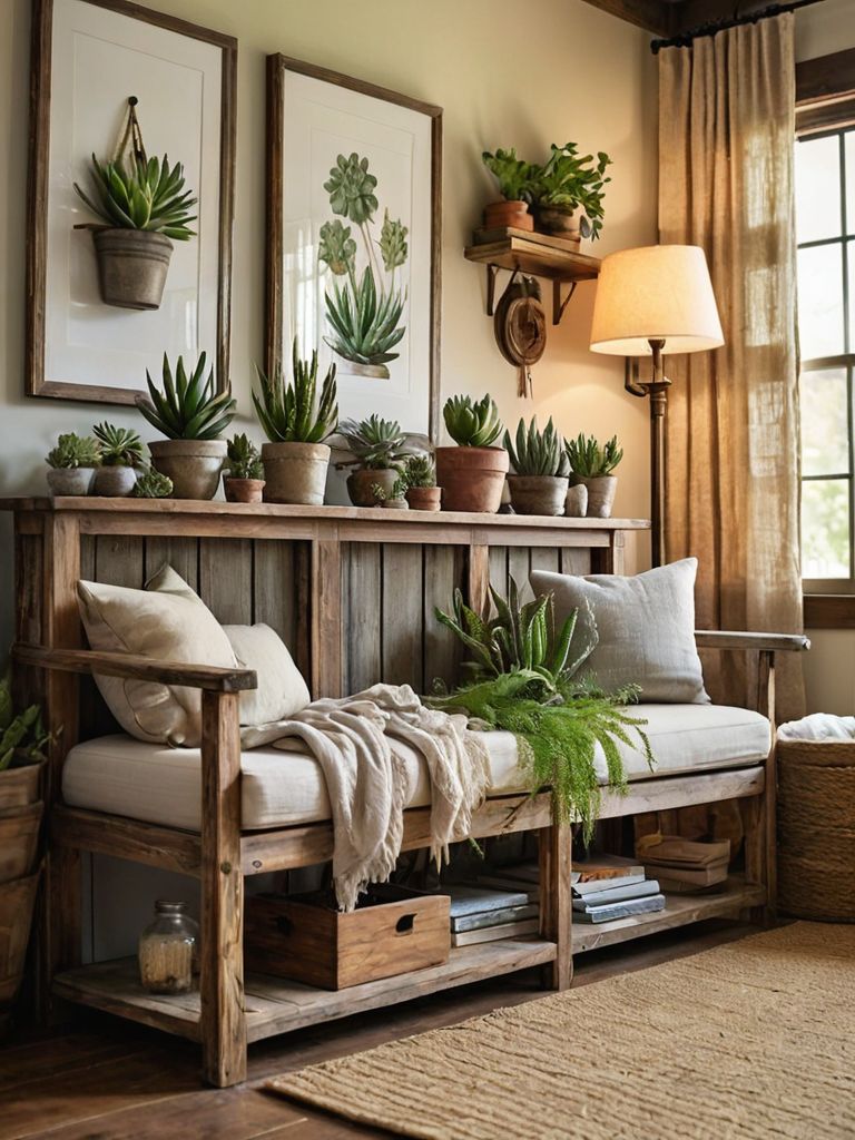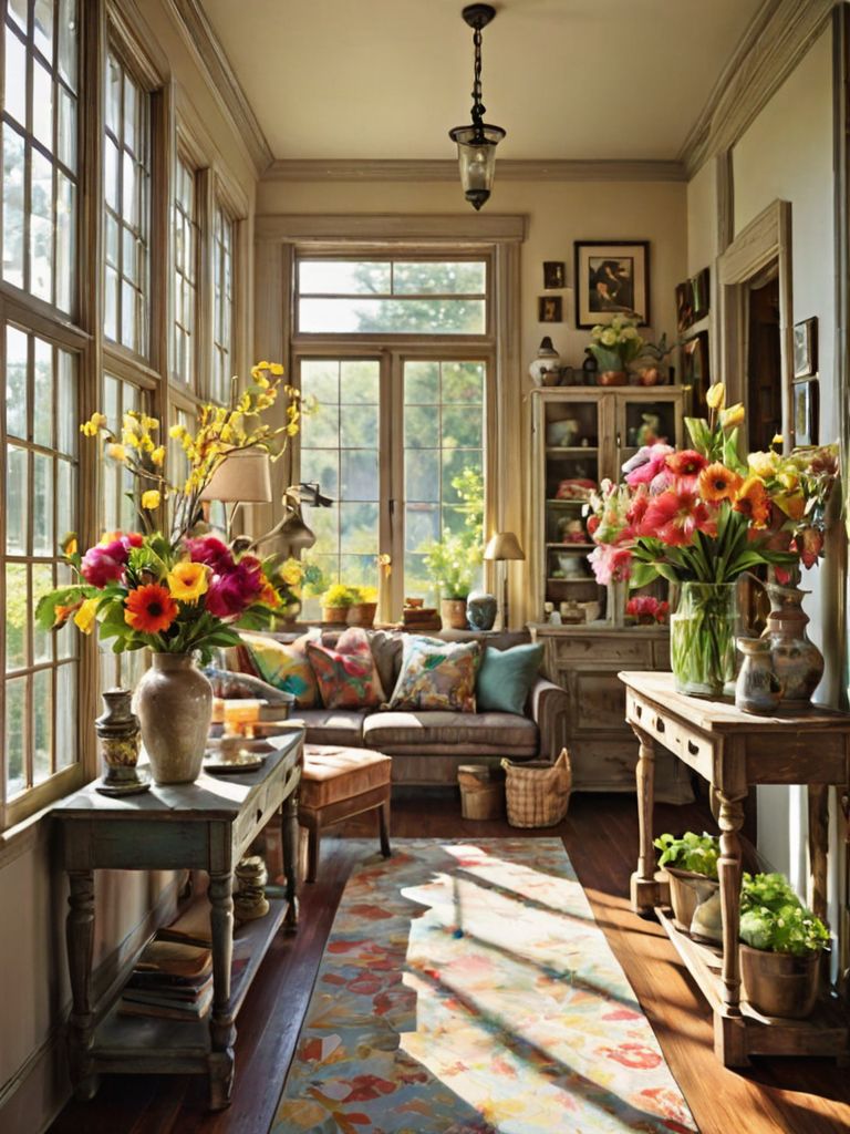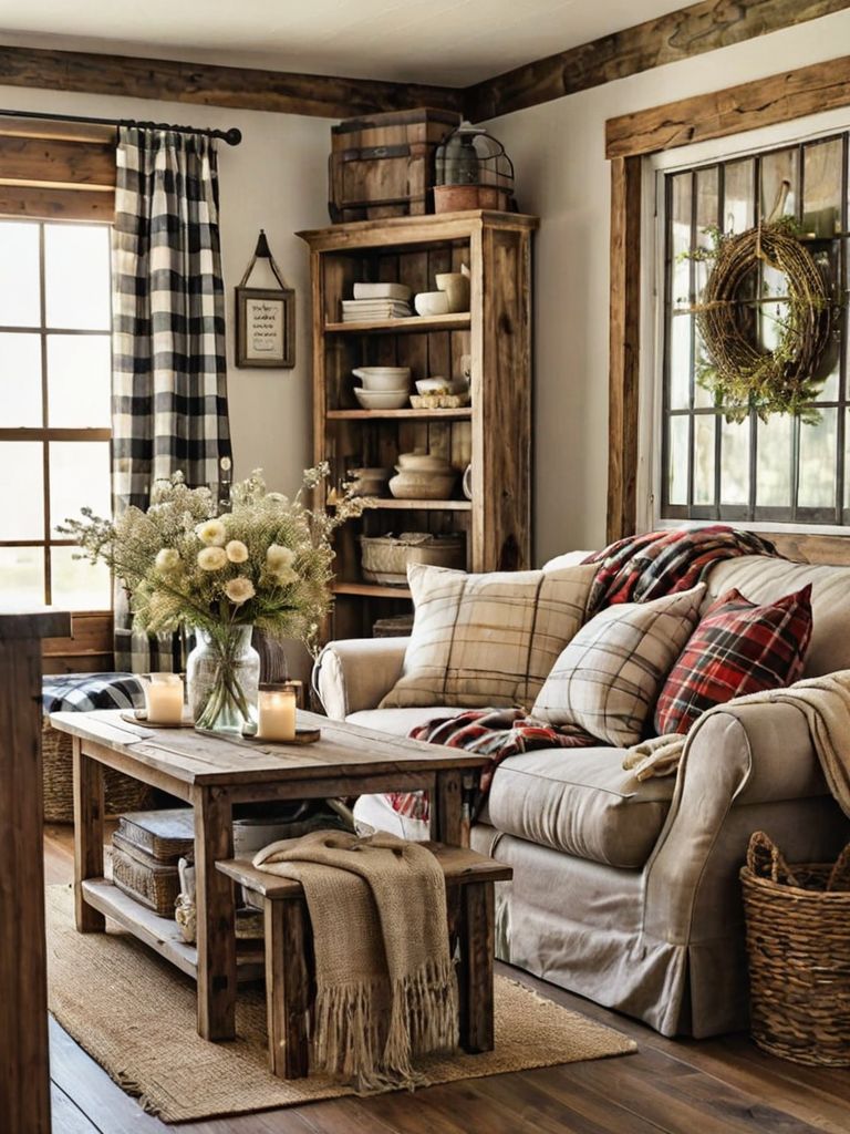Weathered wooden accents, Vintage-inspired furniture, Cozy textiles in soft earth tones, Stone fireplace, Dainty floral arrangementsDescription