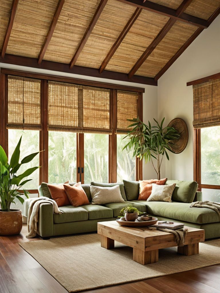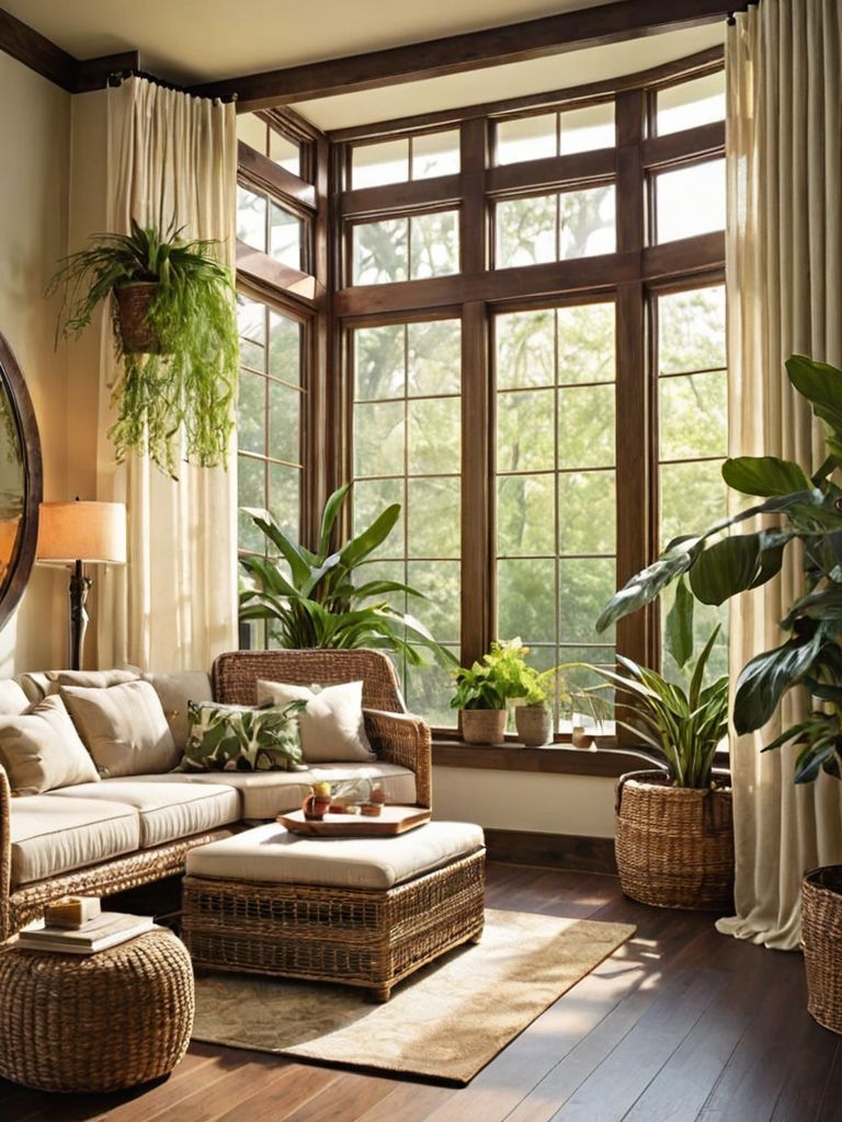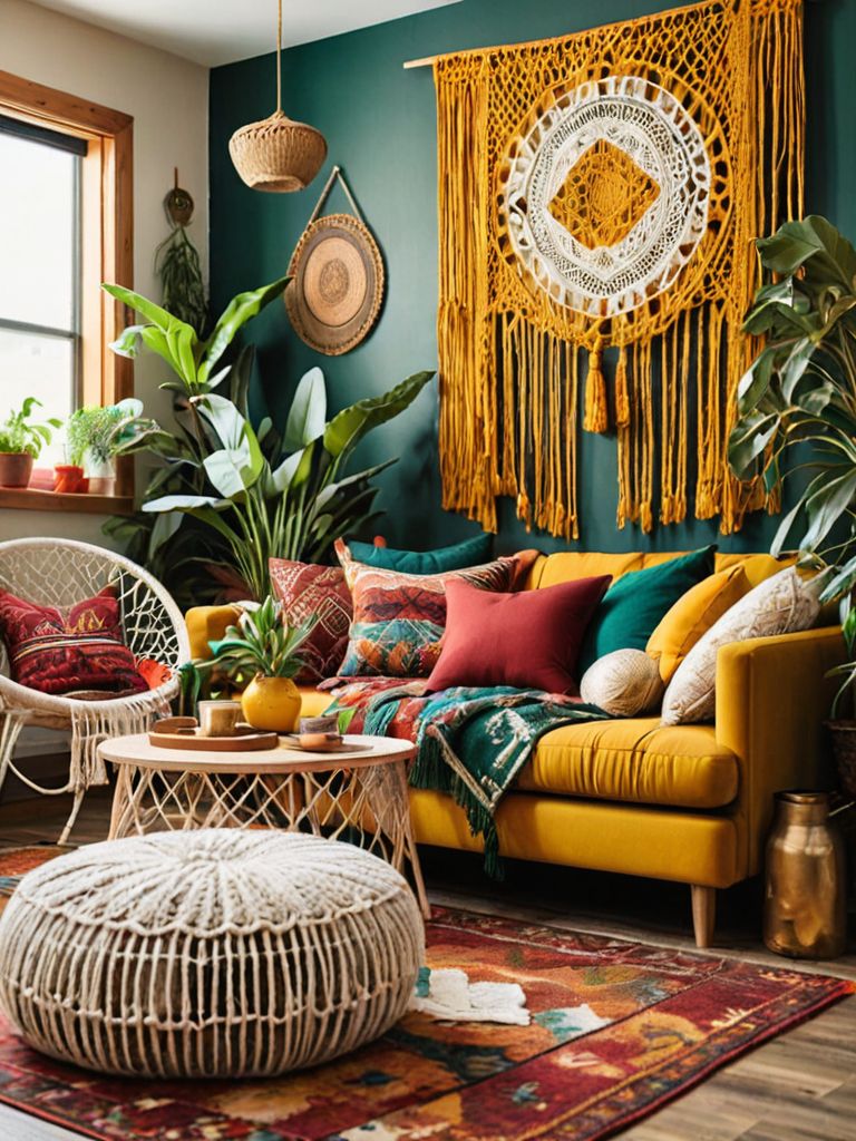 Dreamy Living Room Makeover: Transform your space into a cozy sanctuary with a bohemian twist. Picture plush, white sectionals adorned with an array of colorful ethnic-print pillows, complemented by a low-hanging rattan pendant light. Complete the look with a gallery wall of earthy-toned artwork and macrame wall hangings for an eclectic and inviting atmosphere.