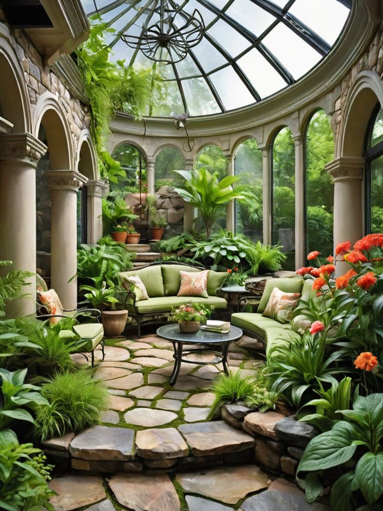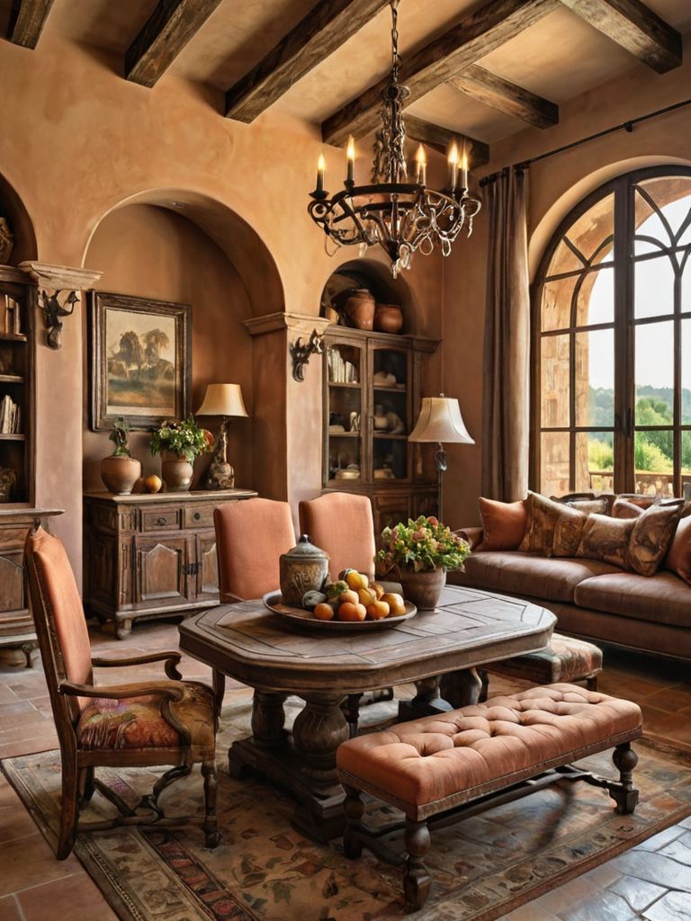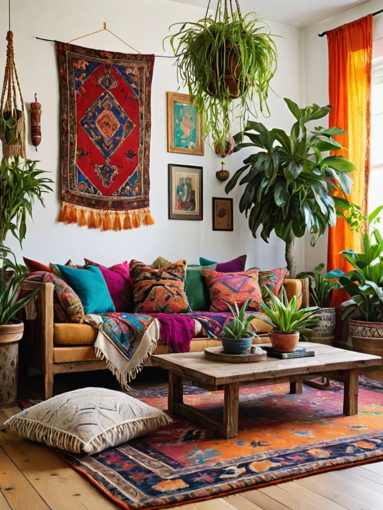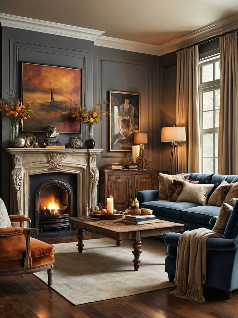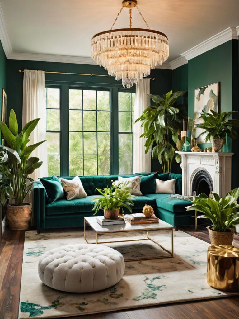 Furniture: Imagine a cozy living room adorned with plush velvet sofas in rich jewel tones, accompanied by matching tufted armchairs. The walls are adorned with eclectic artwork, creating a diverse collection of styles and colors. Soft, ambient lighting is provided by vintage-inspired floor lamps and cascading string lights, casting a warm and inviting atmosphere throughout the space.