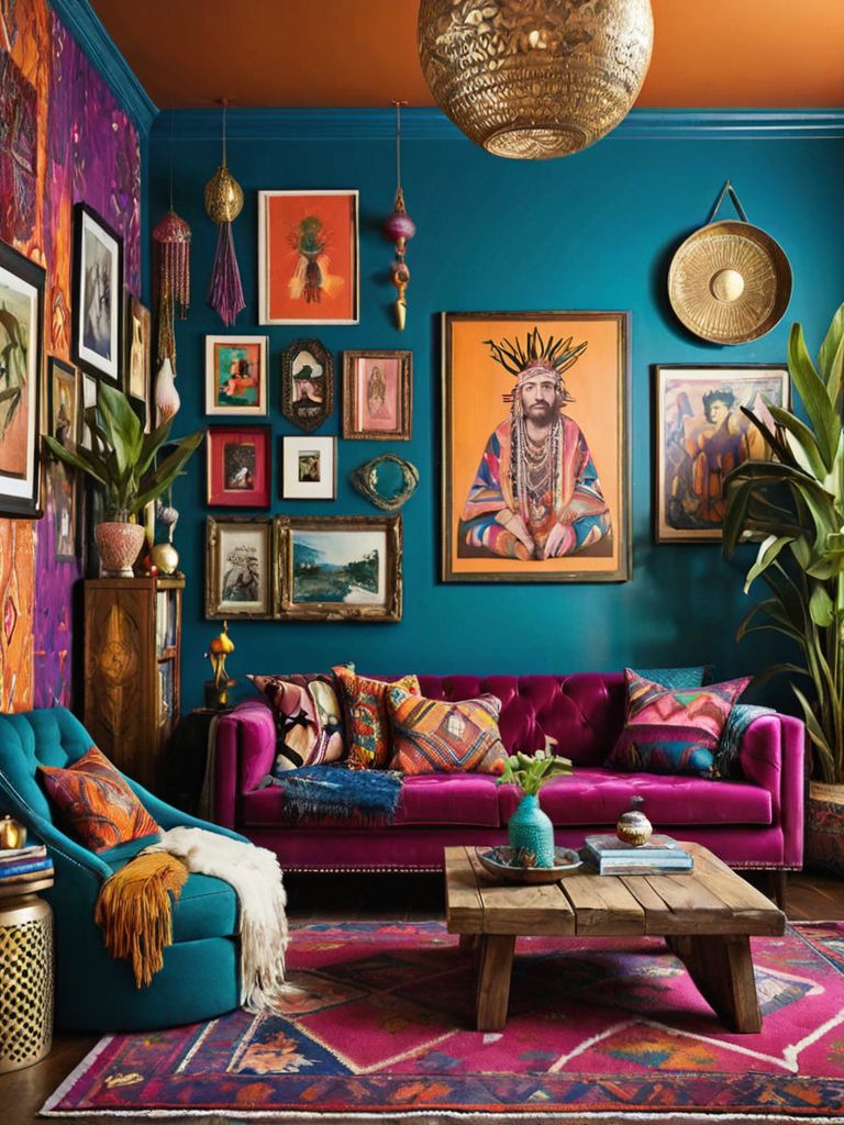 Chic Bohemian Haven - Transform your living room into a bohemian oasis with this home decorating idea. Incorporate vibrant patterns and textures through colorful throw pillows, tapestries, and ottomans. Hang a gallery wall of eclectic art pieces and add a hanging macramé plant holder for a touch of greenery.