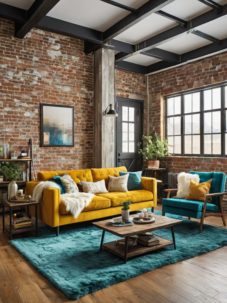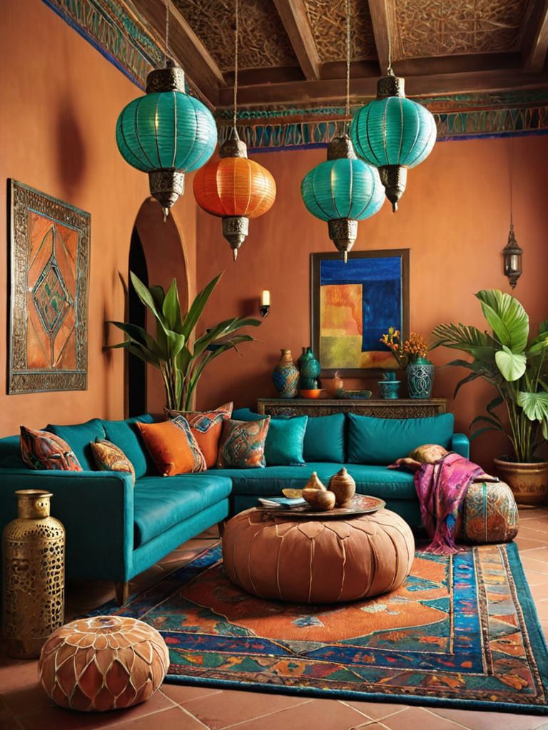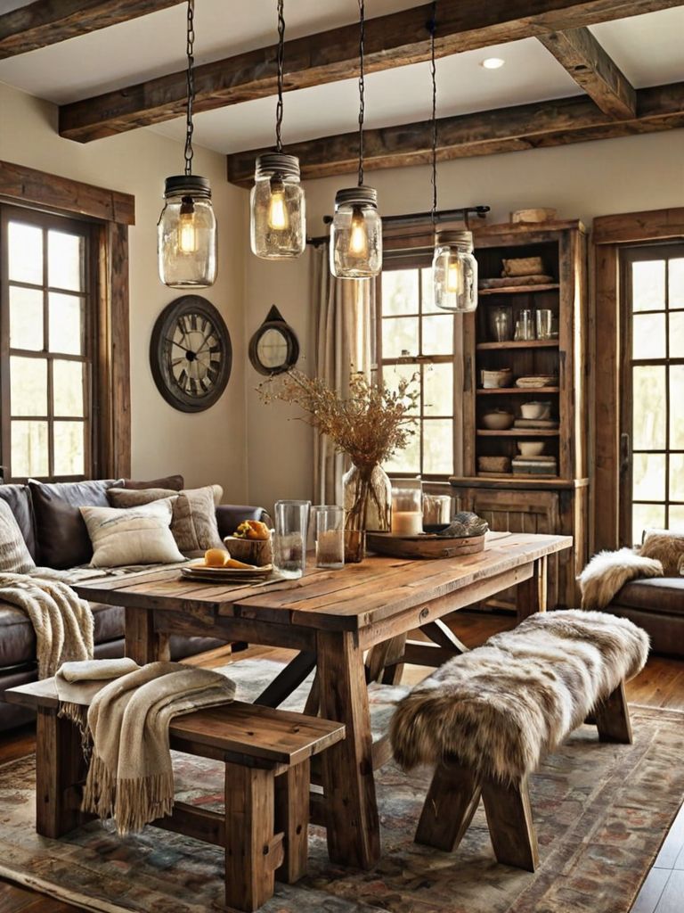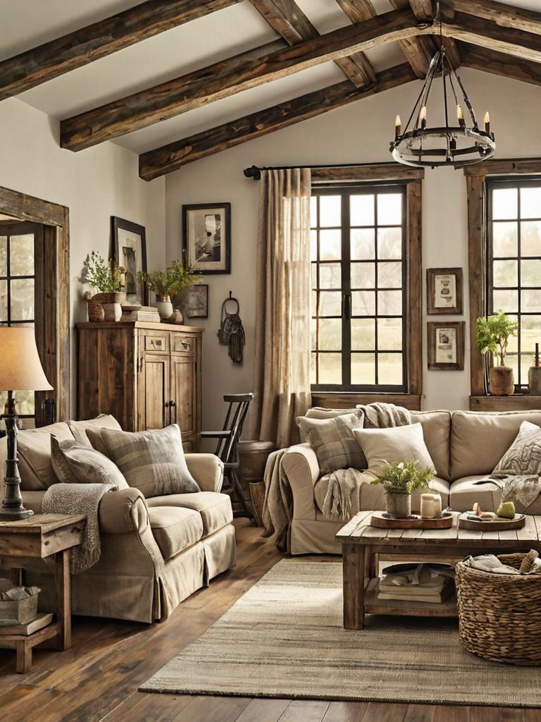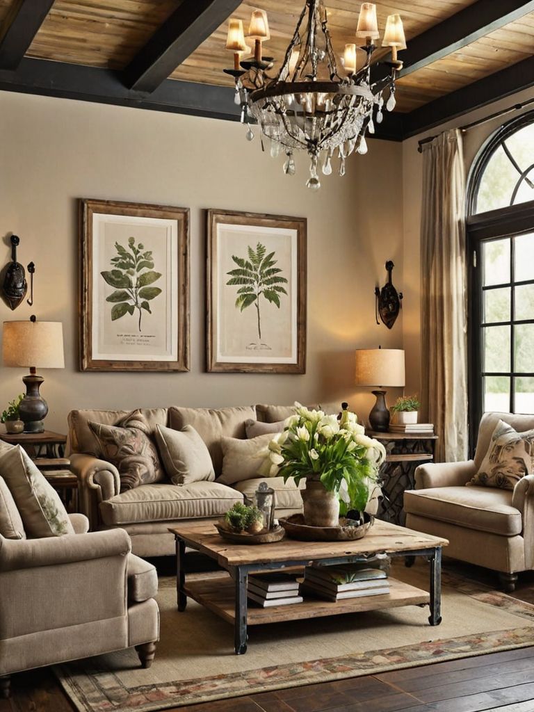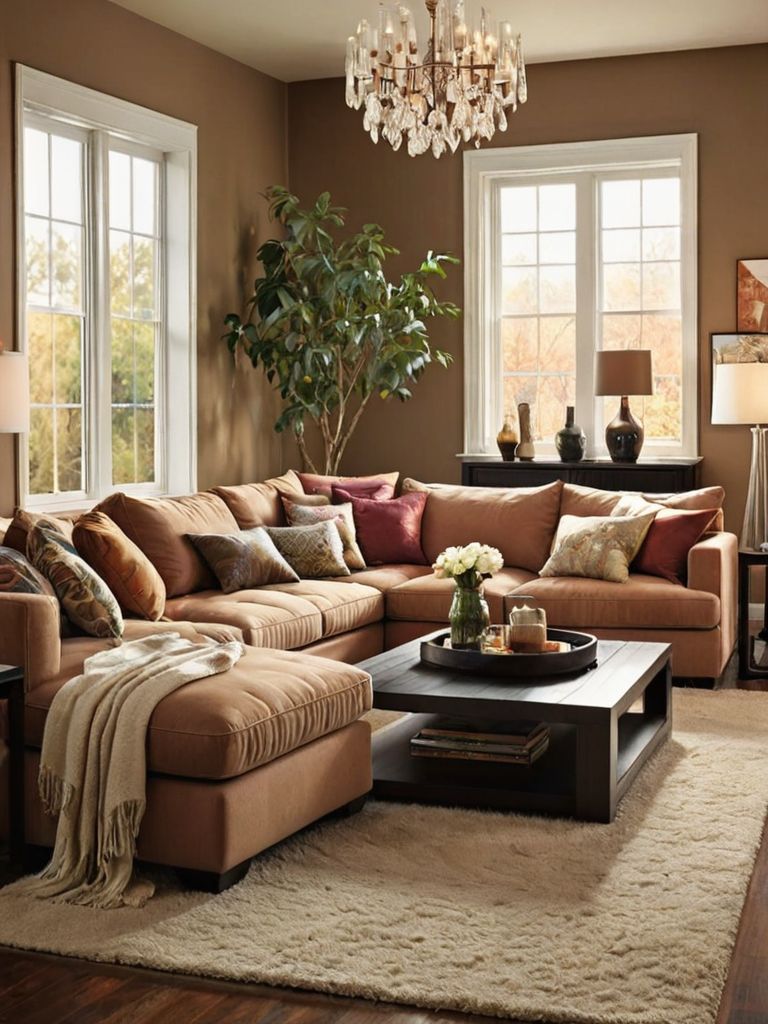 Earthy tone paint, Statement chandelier, Plush oversized throw pillows, Soft fluffy rug, Cozy furnitureDescription
