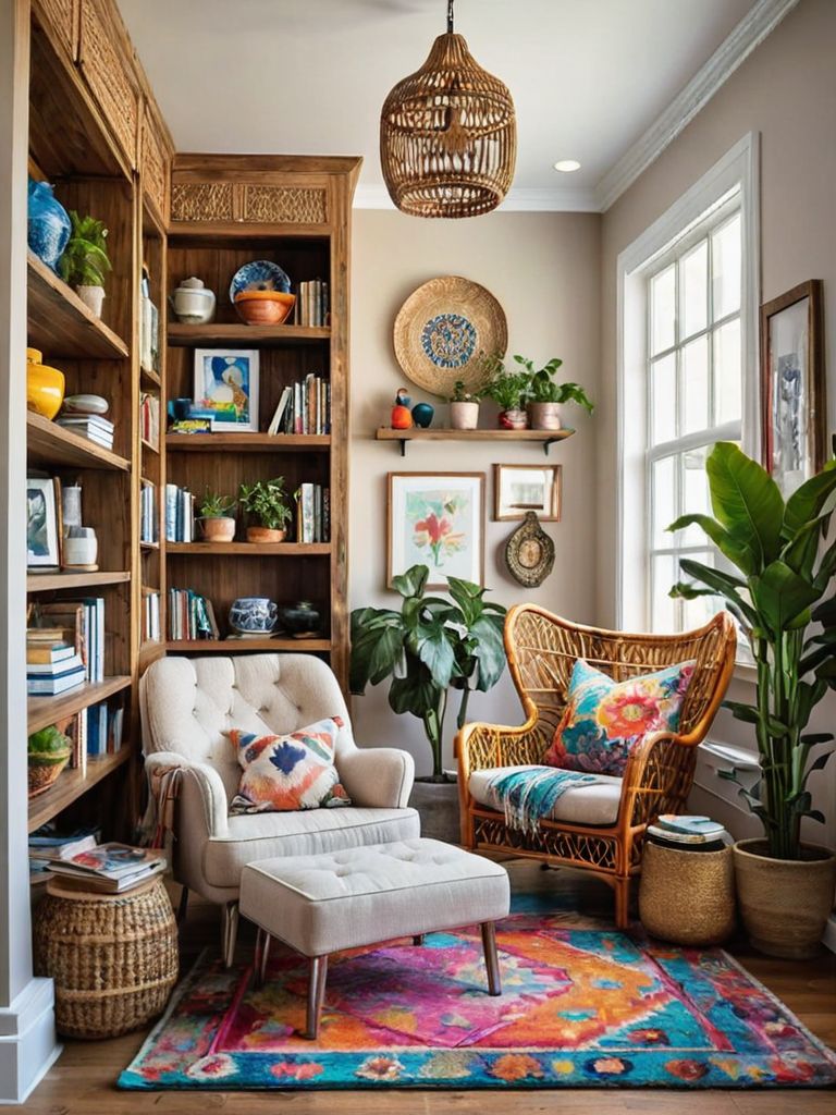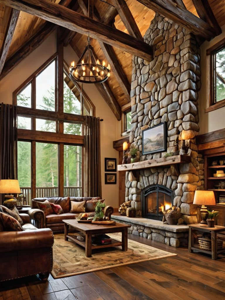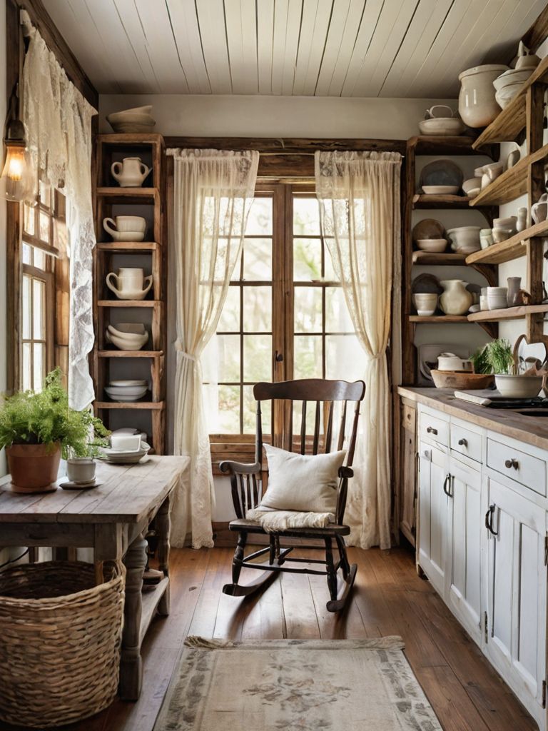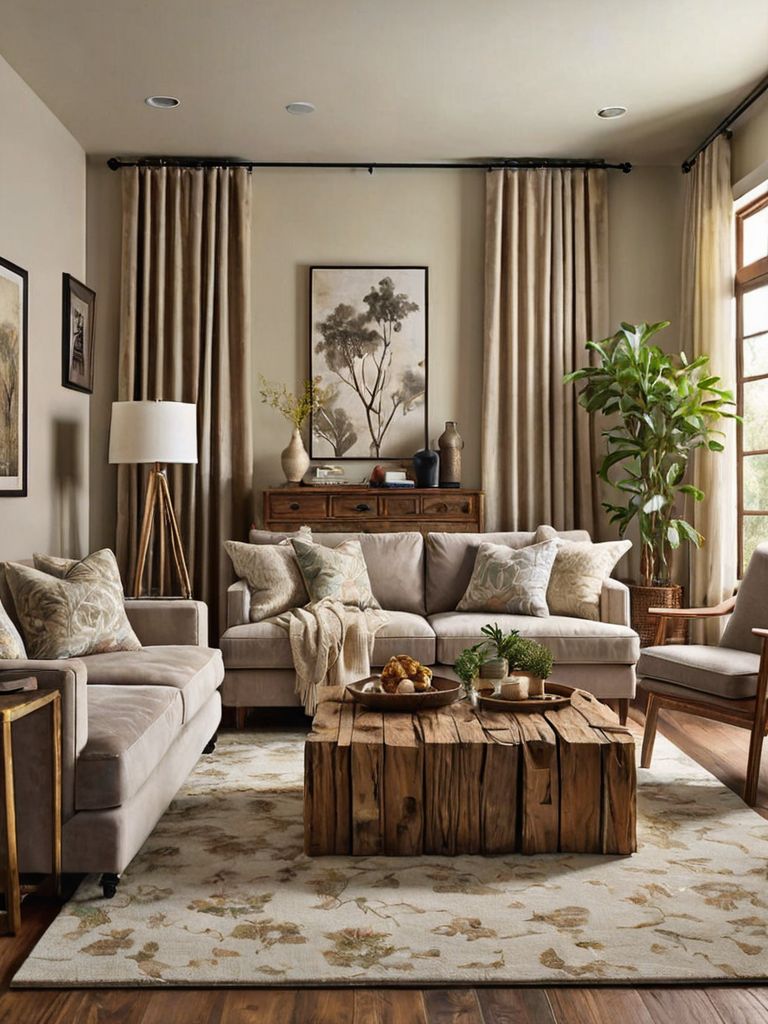 Wooden beams, Rustic furniture pieces, Muted color palette decor, Plush rugs, Vintage botanical printsDescription