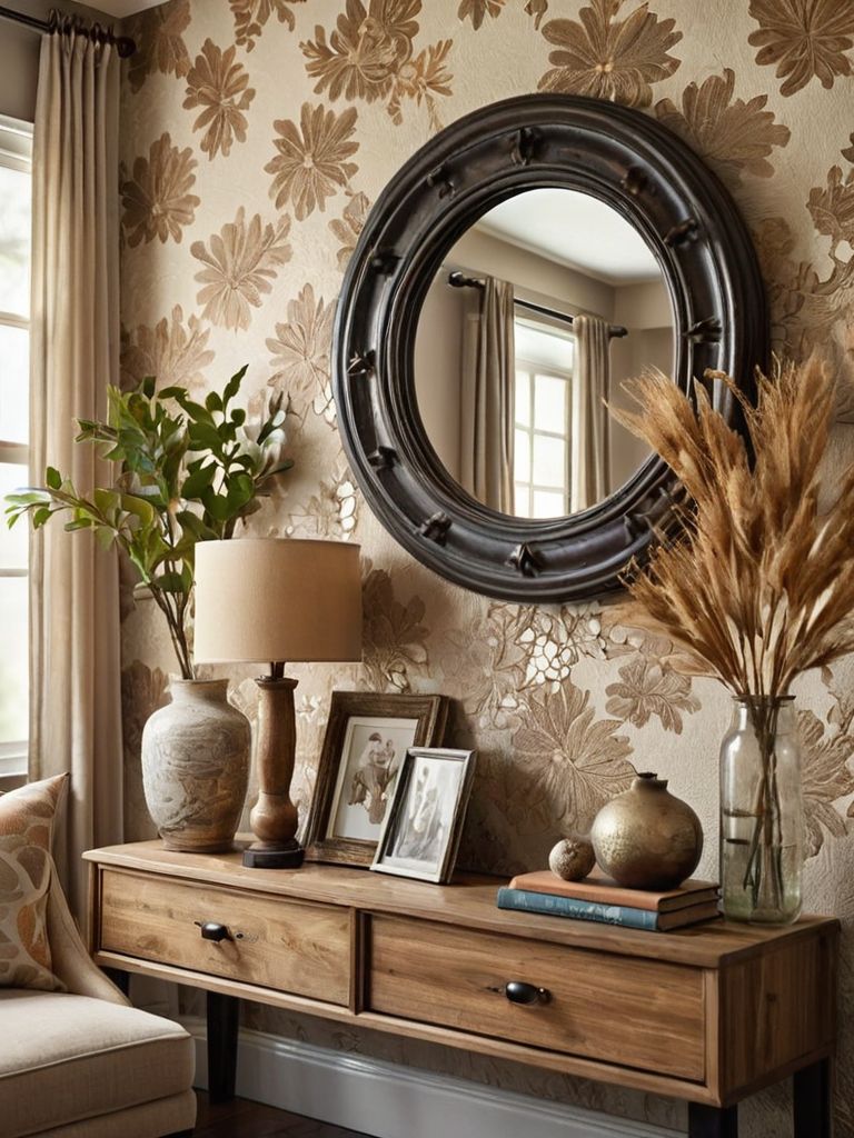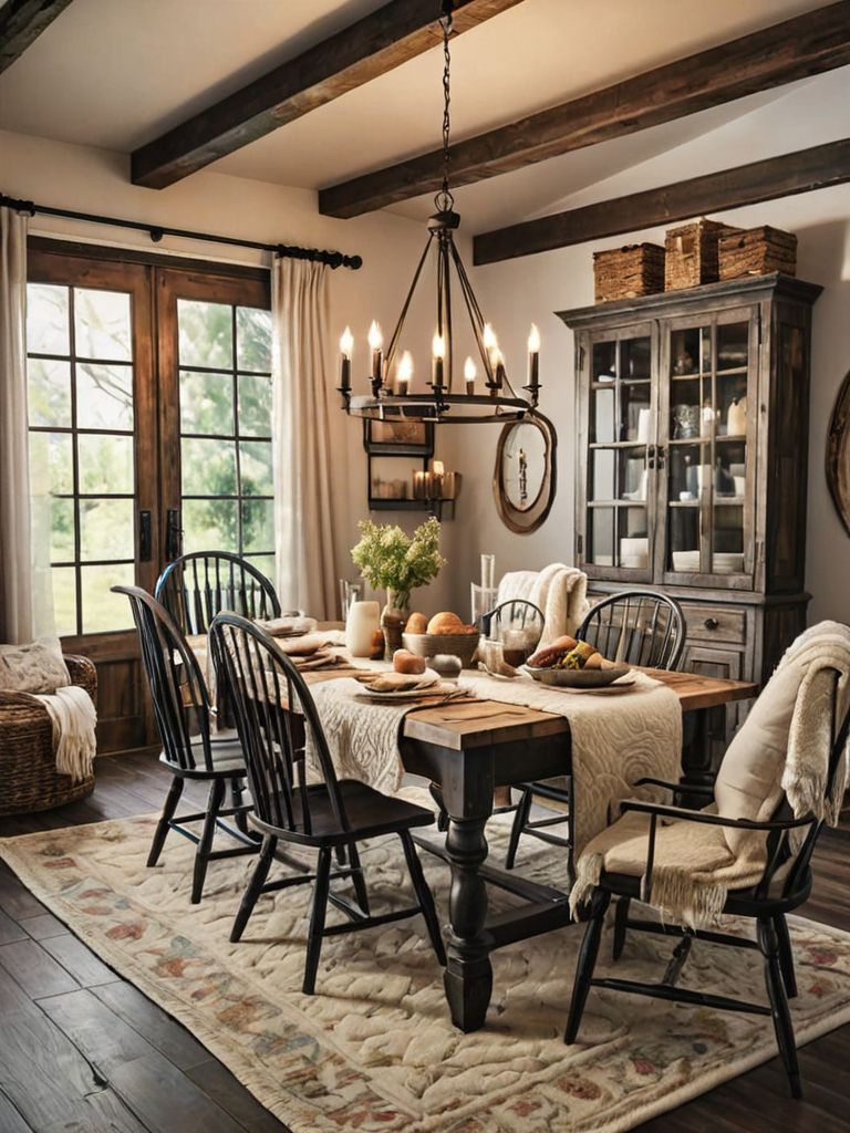Weathered wood furniture, Reclaimed barn doors, Exposed beams, Earthy tones, Cozy textilesDescription