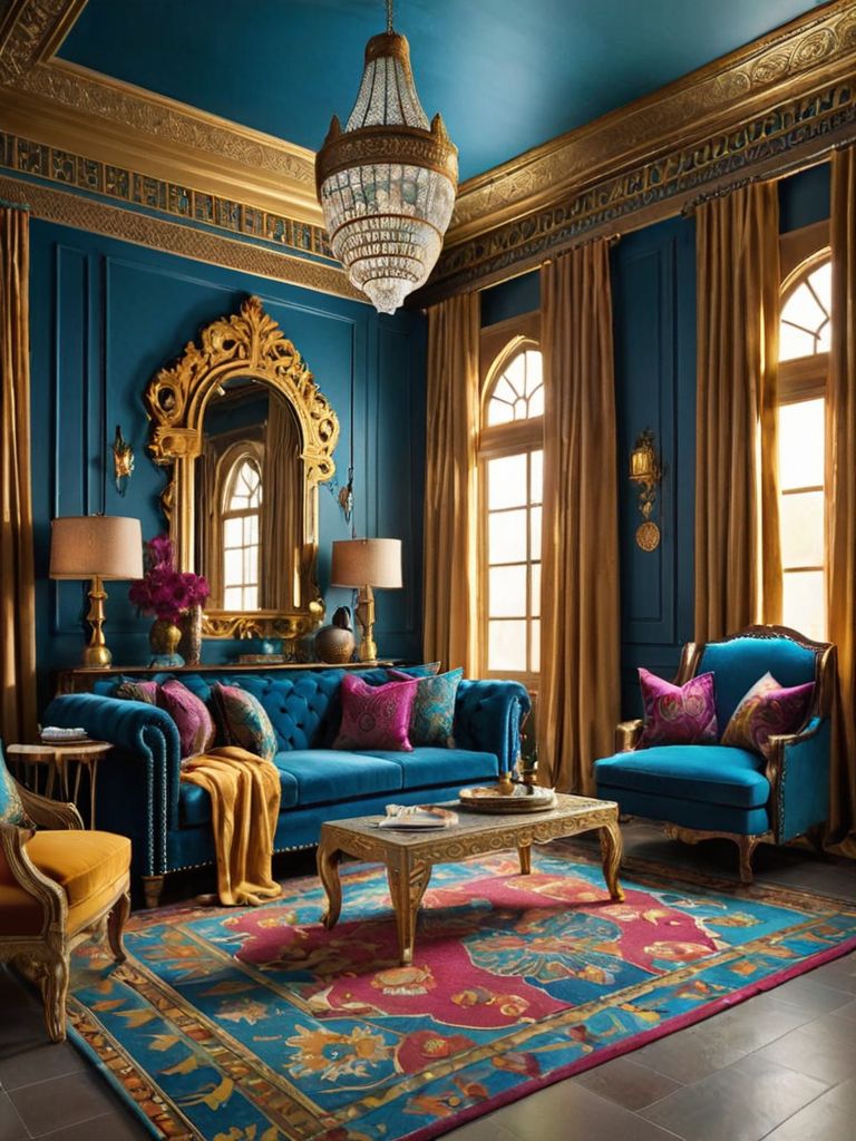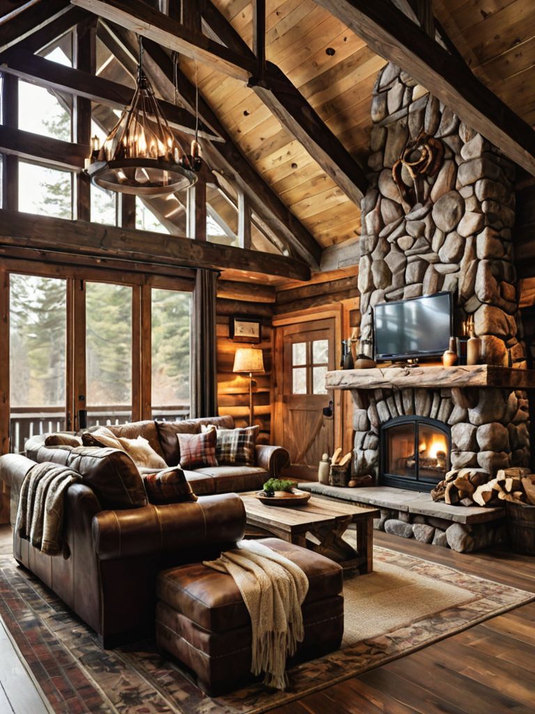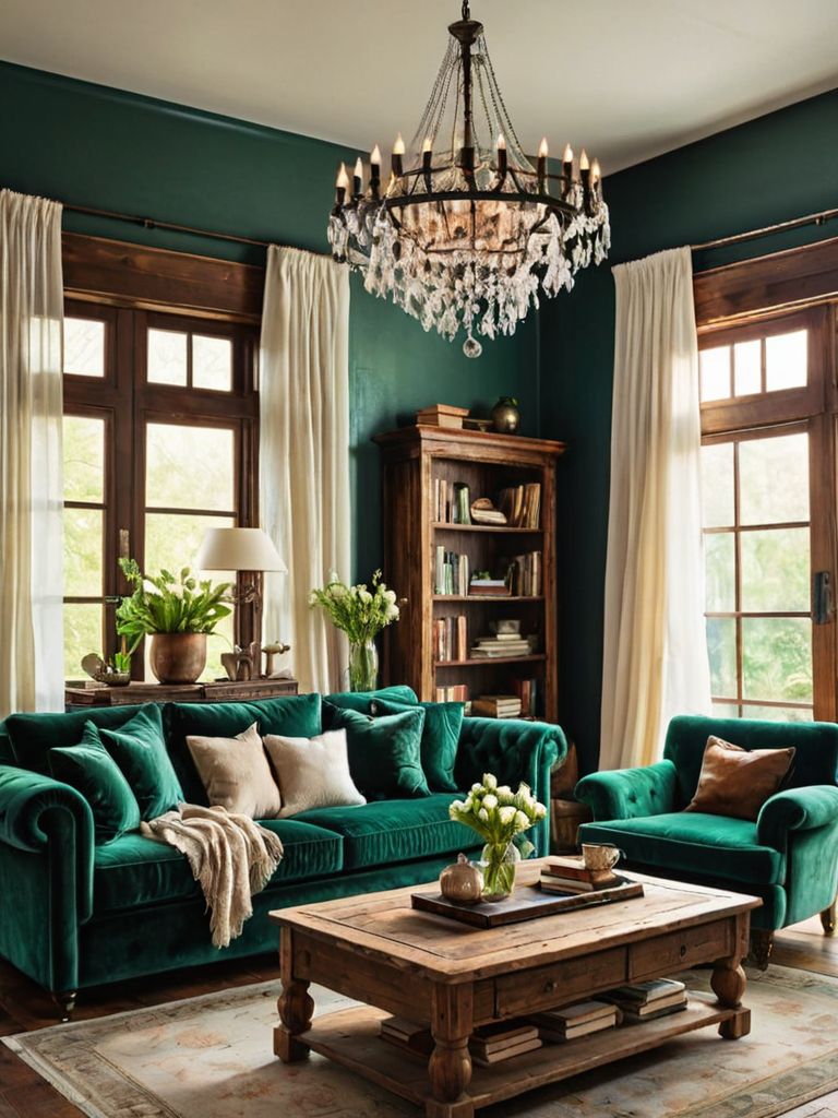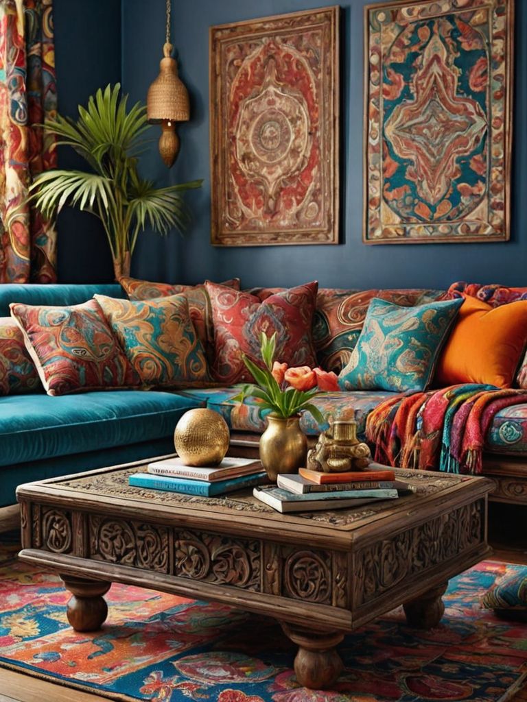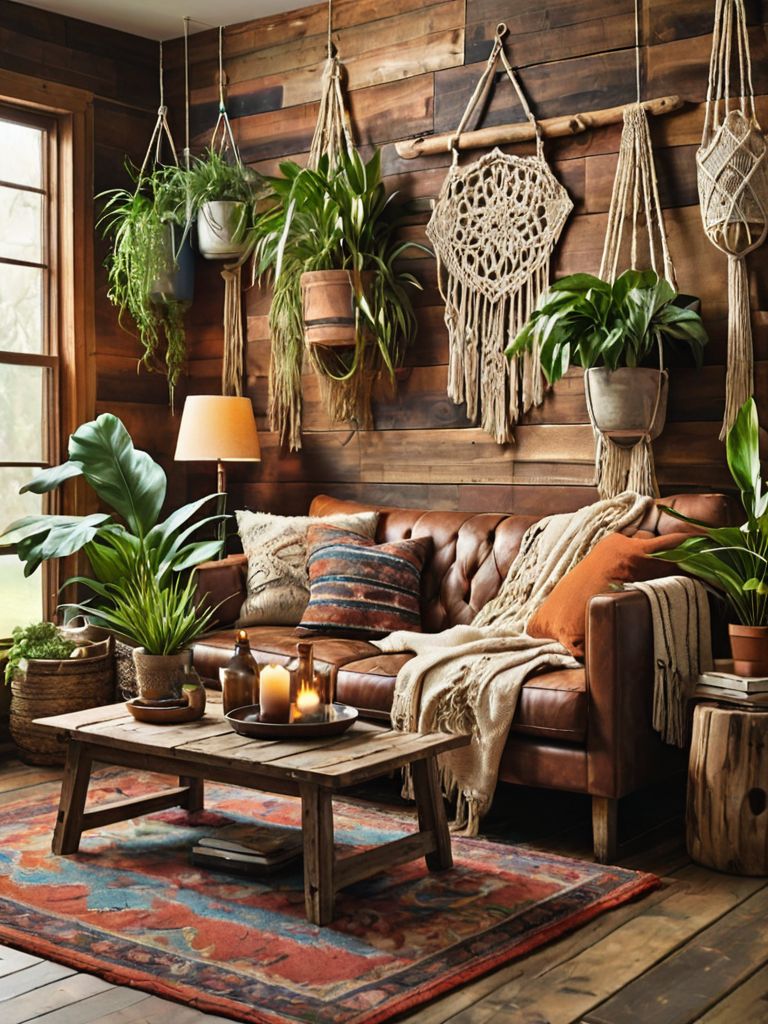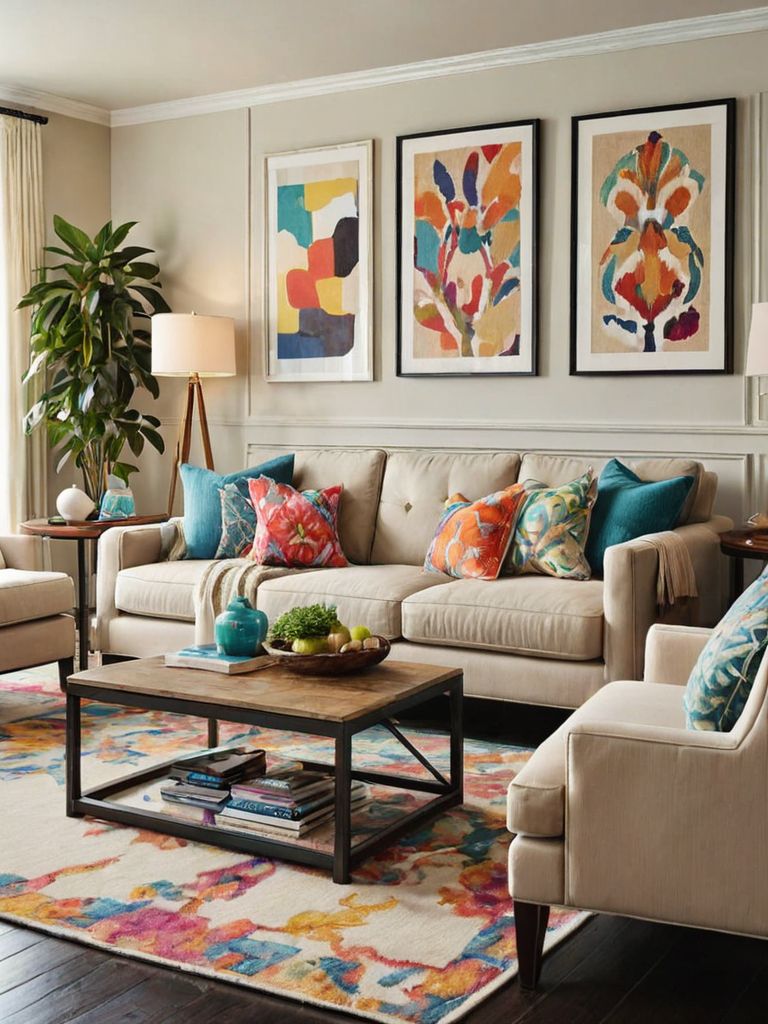 Plush sofas, Rich, earthy tone cushions, Rustic wooden accents, Soft, ambient lighting, Statement piece of artworkDescription