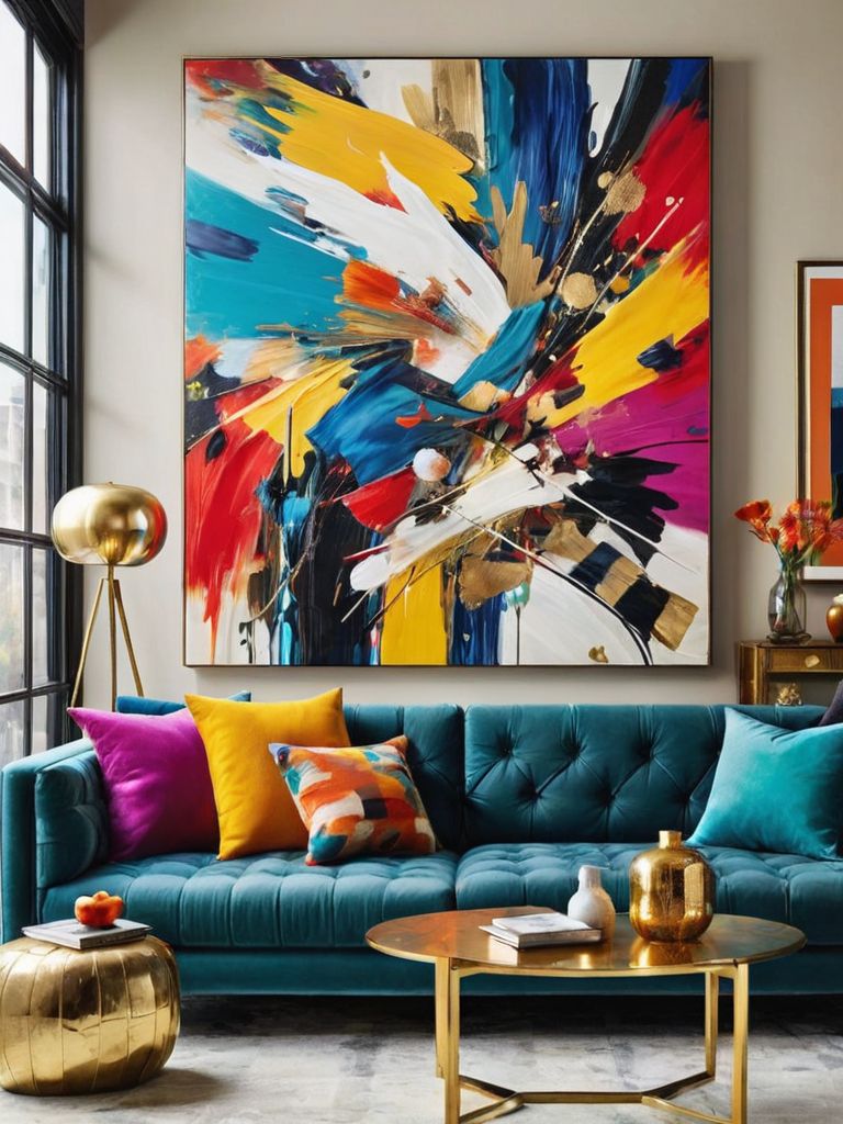 Large canvas painting with bold, colorful brushstrokes, Modern furniture and accessories, Metallic elements for accent, Colorful throw pillows and rugs, Abstract sculpture for a dynamic touchDescription