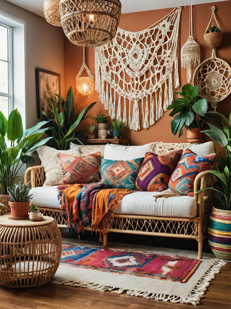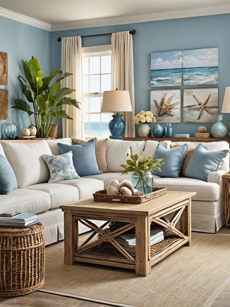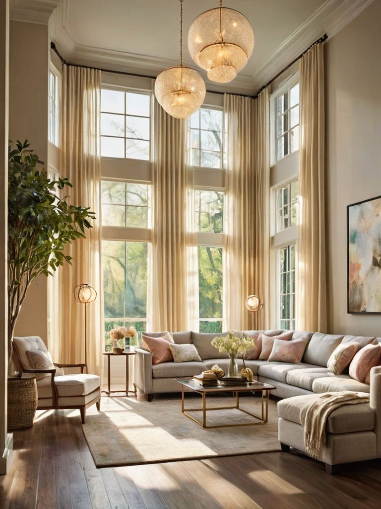 Creamy off-white fabric sofa, Distressed wood coffee table, Vintage-inspired rug, Soft linen curtains, Gallery wall framesDescription