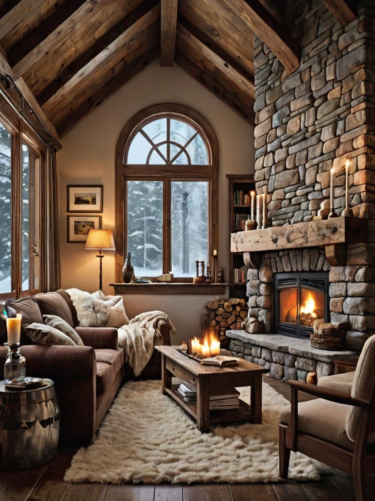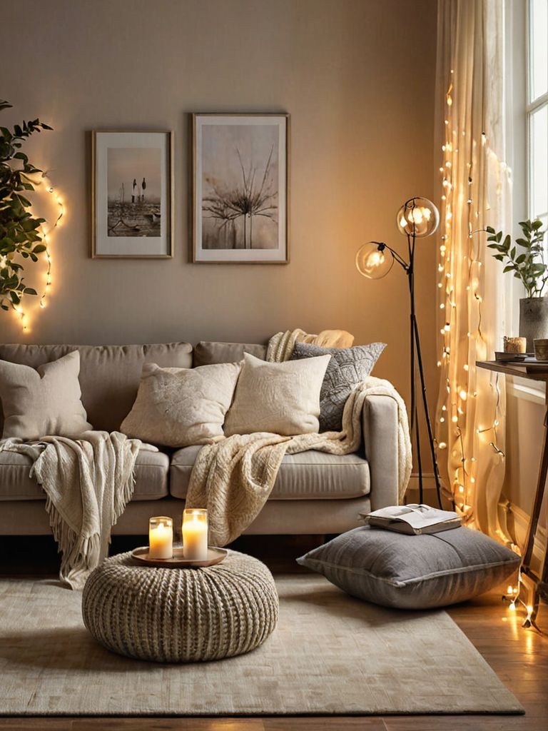 Interior design: Create a cozy farmhouse-inspired living room with warm neutral colors and rustic elements. Start by selecting a plush, yet durable sofa in a creamy off-white fabric and pair it with a distressed wood coffee table featuring intricate carving details. Complete the look with a vintage-inspired rug, soft linen curtains, and a gallery wall of black and white photographs in weathered wood frames.