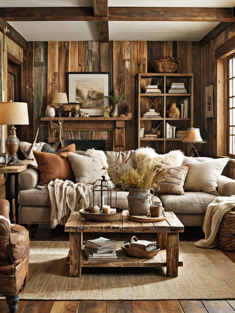 Aged wooden furniture, Distressed finishes, Vintage-inspired accents, Plaid textiles, Neutral earth tone decorDescription