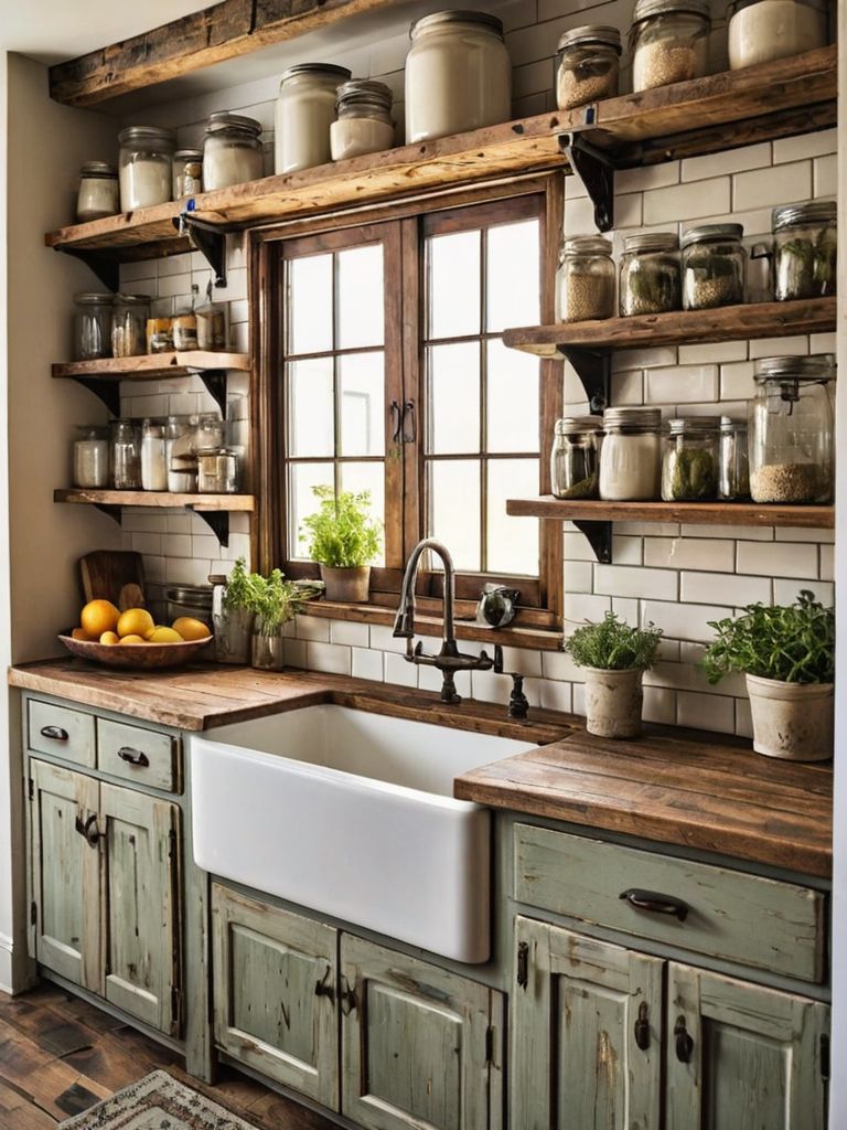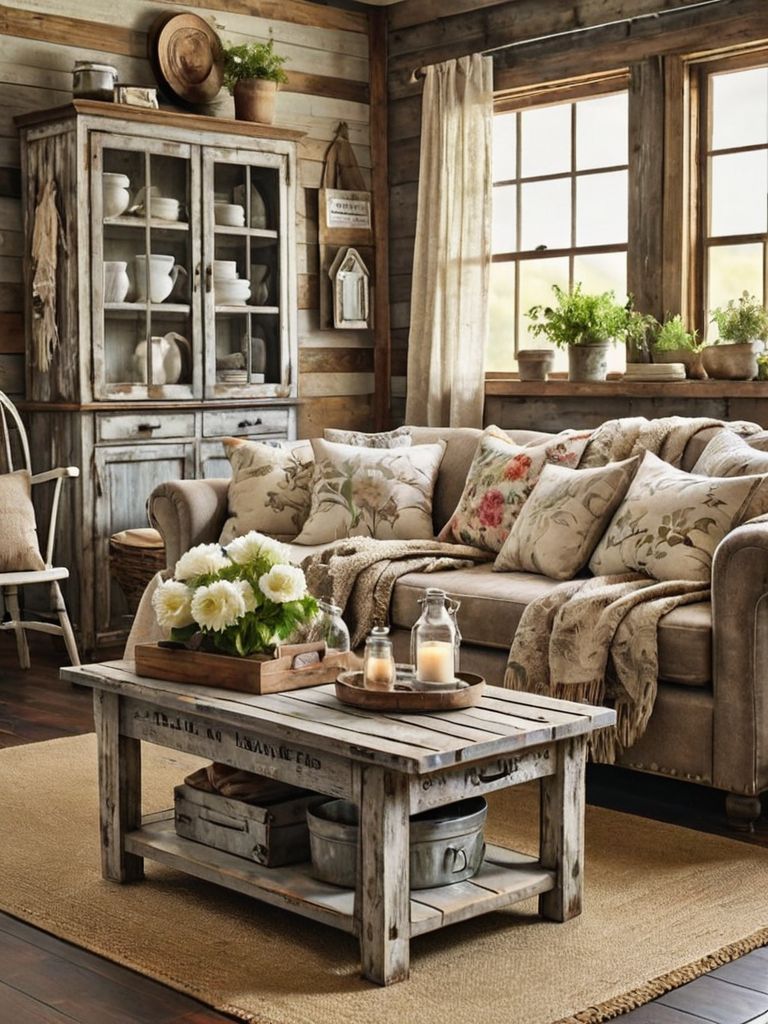 Weathered barnwood accents, Vintage metal decor, Distressed furniture, Shabby chic textiles, Palette of earthy tonesDescription