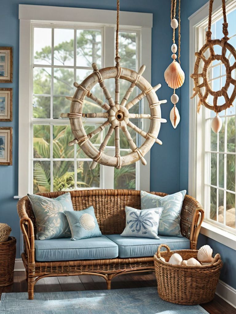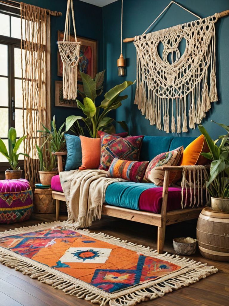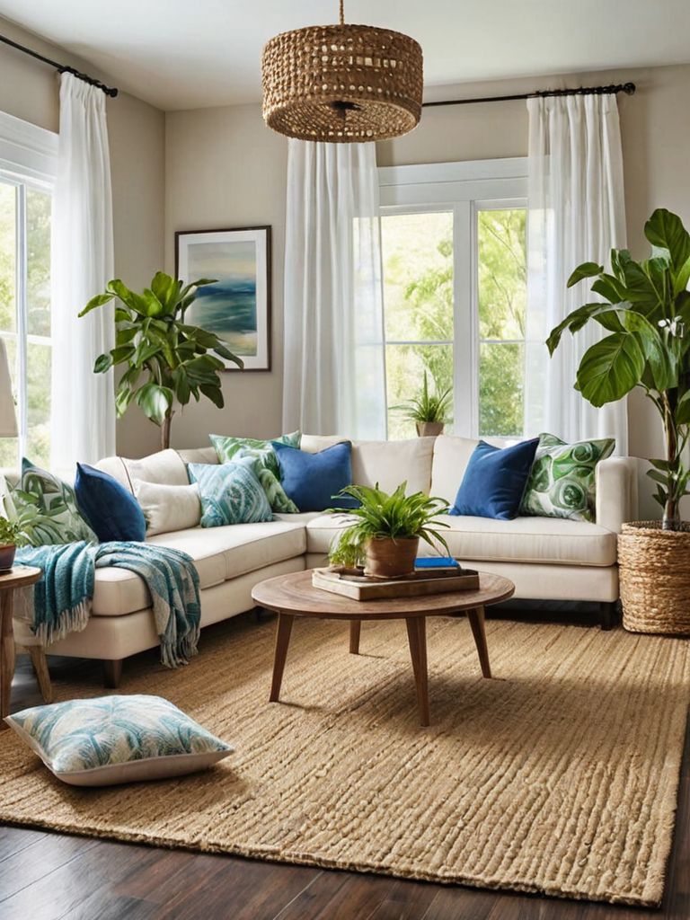 Blue velvet accent chairs, Velvet throw pillows, Decorative vases, Statement wall art, Floor rugsDescription