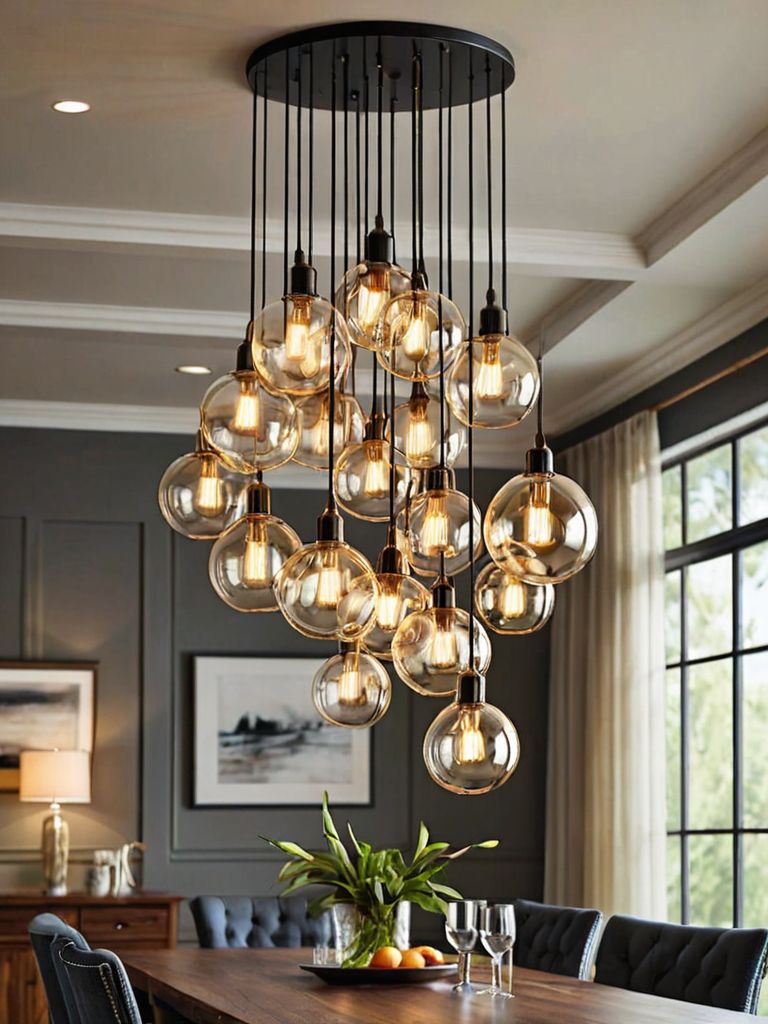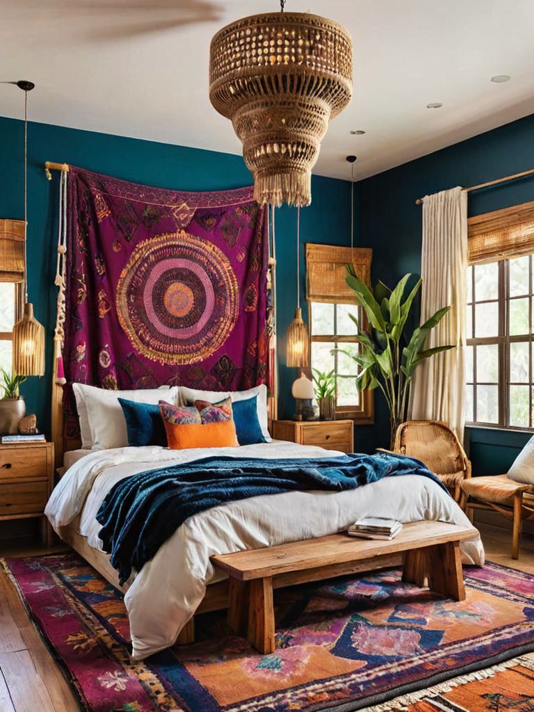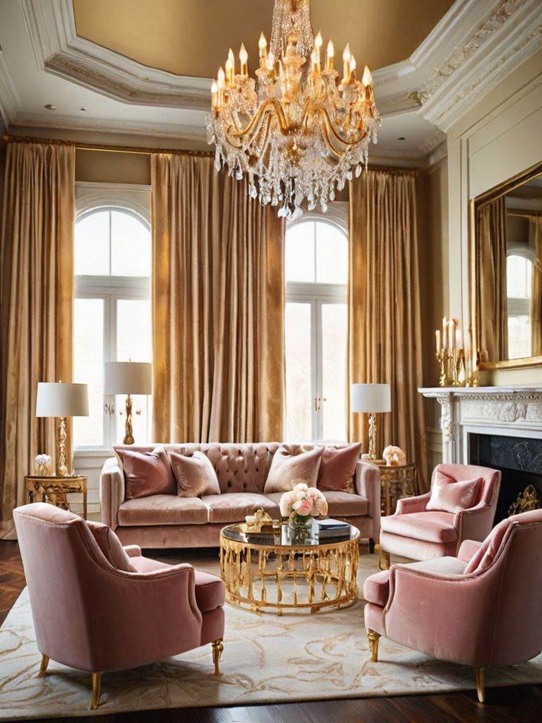 Plush velvet sofas, Jewel-toned cushions and throws, Eclectic artwork for gallery wall, Vintage rug, Sleek coffee tableDescription