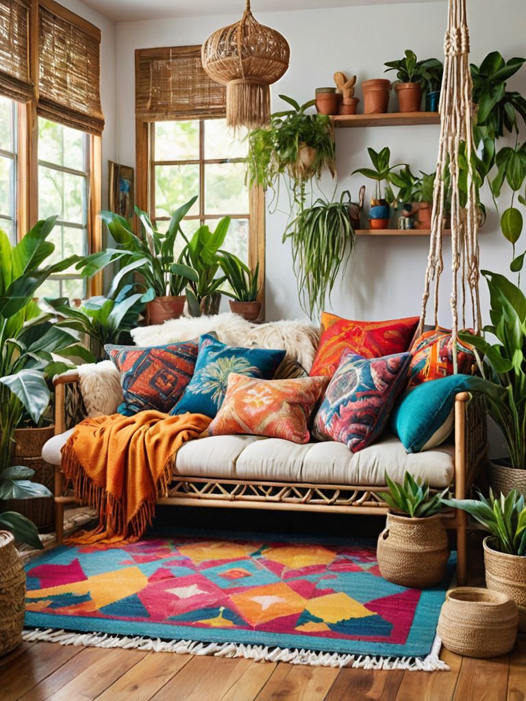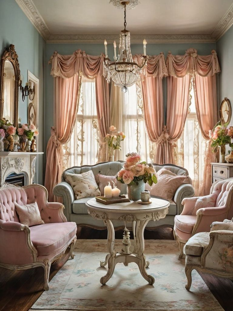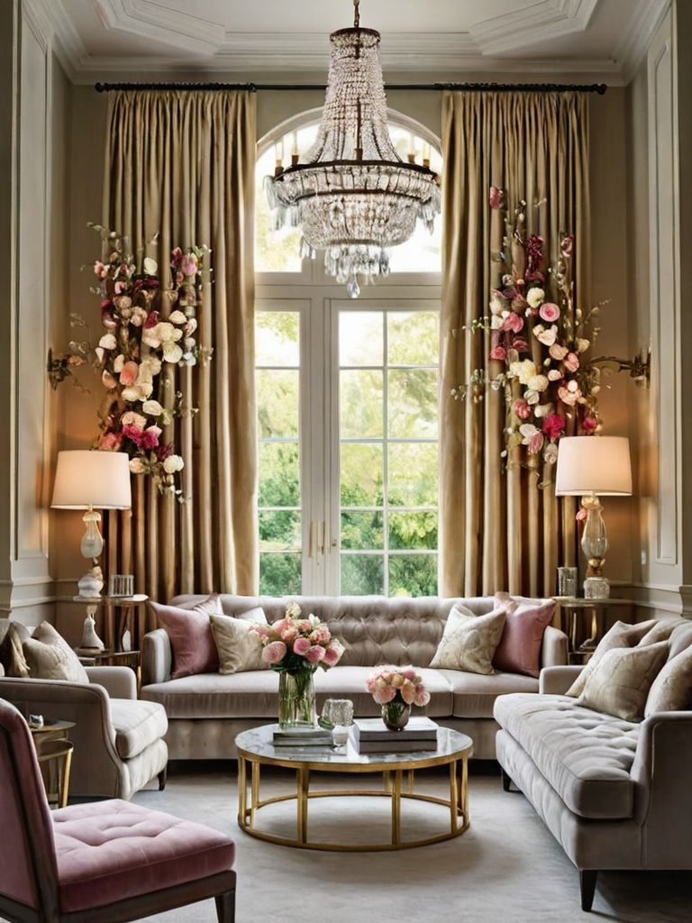 Chic and cozy living room: Imagine a sun-drenched space with plush velvet sofas in a neutral color palette, accented with jewel-toned cushions and throws. A statement gallery wall displaying eclectic artwork adds a touch of personality, while floor-to-ceiling windows adorned with sheer curtains allow natural light to cascade in. Complete the look with a vintage rug and a sleek coffee table for the perfect blend of elegance and comfort in your dream living room.