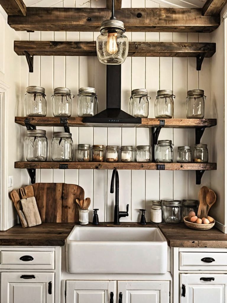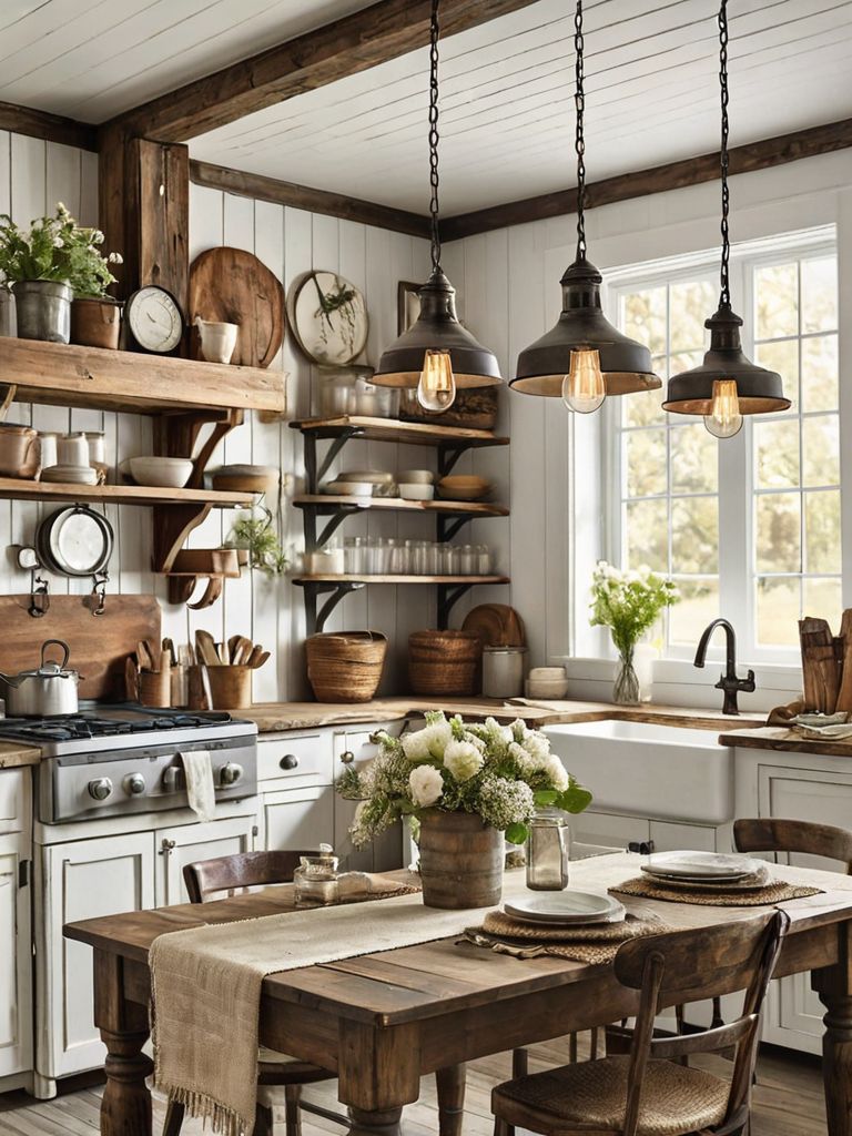 Reclaimed wood shelving unit, Stone accent wall, Vintage-inspired dining table, Woven throw blanket, Earthy-toned throw pillowsDescription