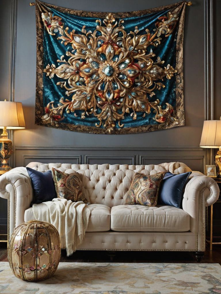 Vibrant Bohemian Oasis: Create a captivating and harmonious living space with intricate tapestries, vibrant fabrics, and an abundance of plush pillows. Adorn the walls with an eclectic mix of dreamcatchers, macrame hangings, and framed botanical prints, infusing the room with a sense of wanderlust and free-spirited energy. Introduce an array of potted succulents and cascading greenery to enliven the corners, while adding natural warm-toned rugs and wooden furniture to ground the space and create a tranquil atmosphere.