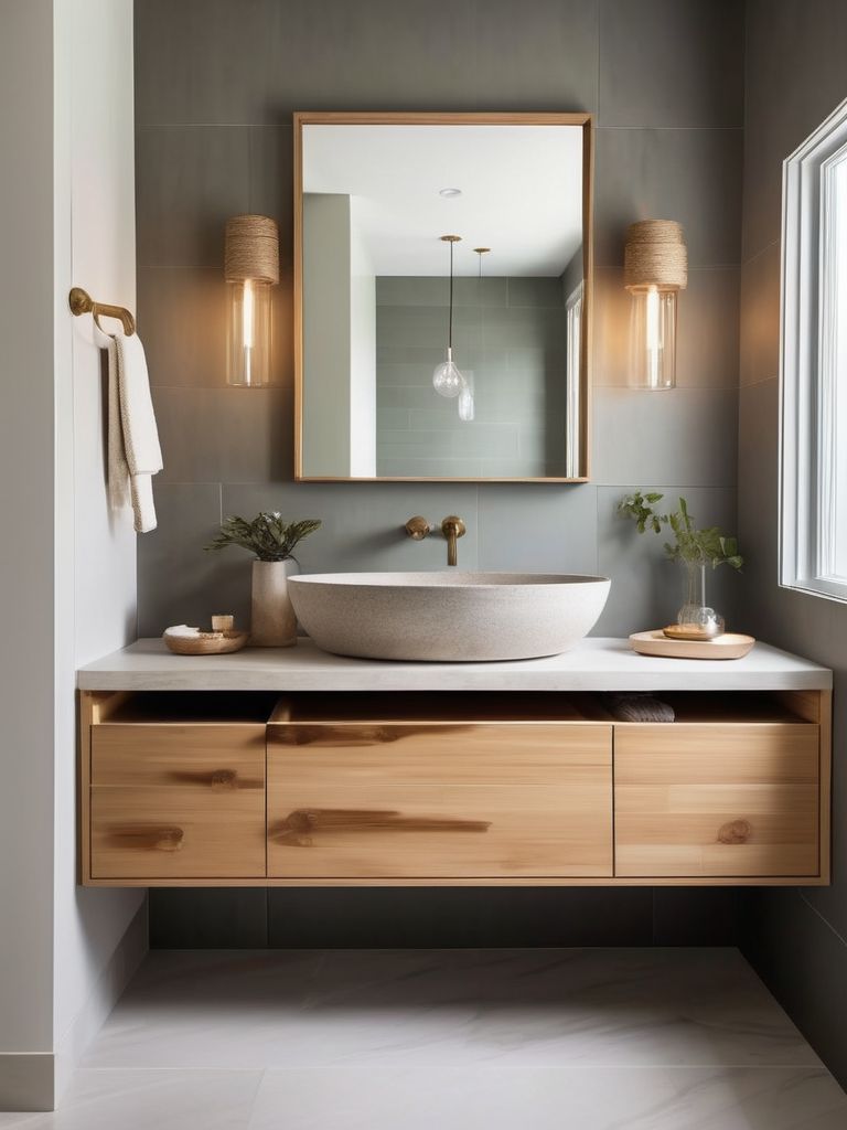 Bamboo bath mat, Stone soap dispenser, Neutral colored towels, Greenery for bathroom decor, Modern bathroom fixturesDescription