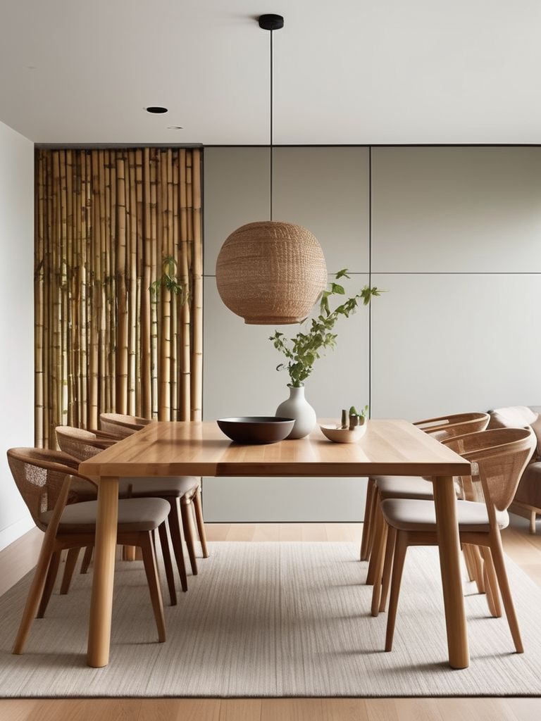 Bamboo placemats, Stone coasters, Linen tablecloth, Minimalist dining chairs, Soft lighting fixturesDescription