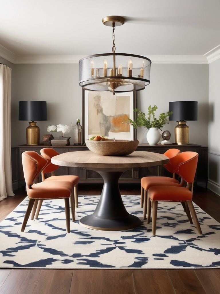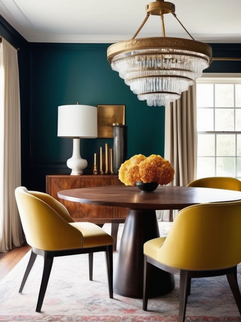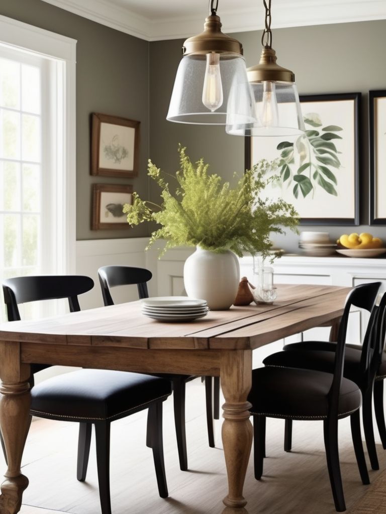 Antique dining table and chairs, Modern lighting fixtures, Bold artwork, Sustainable materials for decor, Eco-friendly tablewareDescription