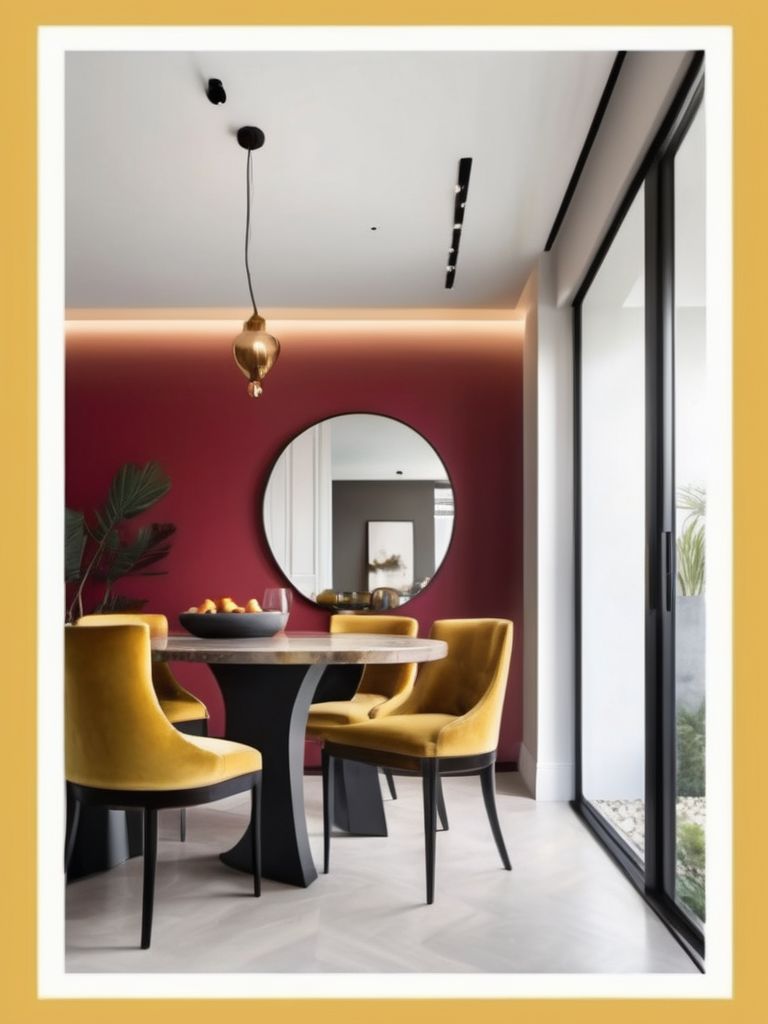 Create a statement dining room with grandeur by incorporating bold wall art and visually striking mirrors. Select large-scale, colorful artwork that complements the room's aesthetic and adds a focal point. Pair this with strategically placed mirrors to enhance the sense of space and light. Consider combining different shapes and designs to create a visually dynamic and captivating atmosphere. Elevate your dining experience with this bold and sophisticated interior design.