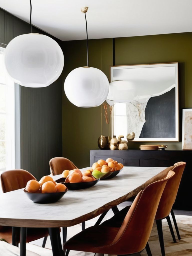 Large-scale colorful wall art, Visually striking mirrors, Different shapes and designs of mirrors, Grandeur dining room furniture, Lighting fixtures for enhancing ambianceDescription