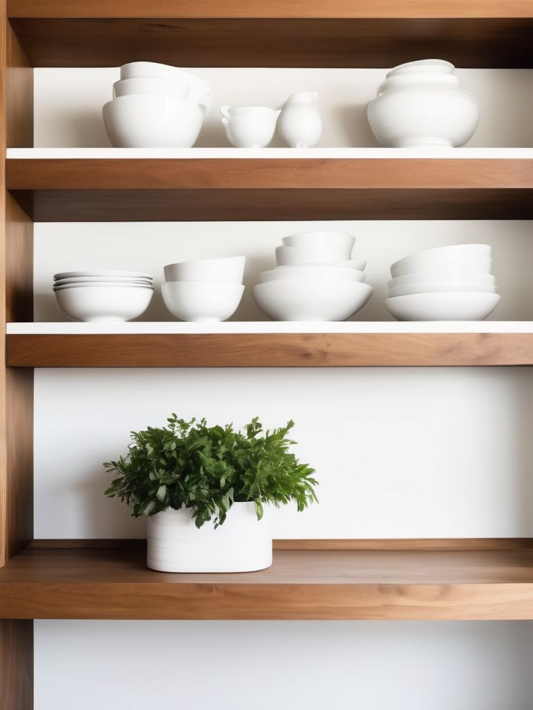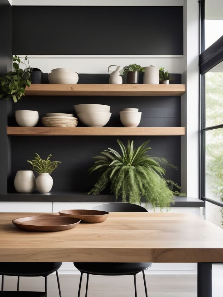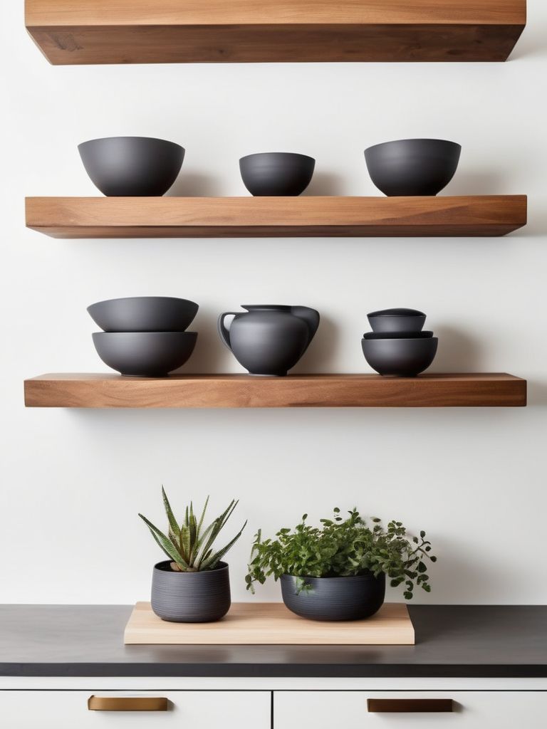 Floating shelves, Elegant dinnerware, Succulent plants, Soothing artwork, Natural materialsDescription