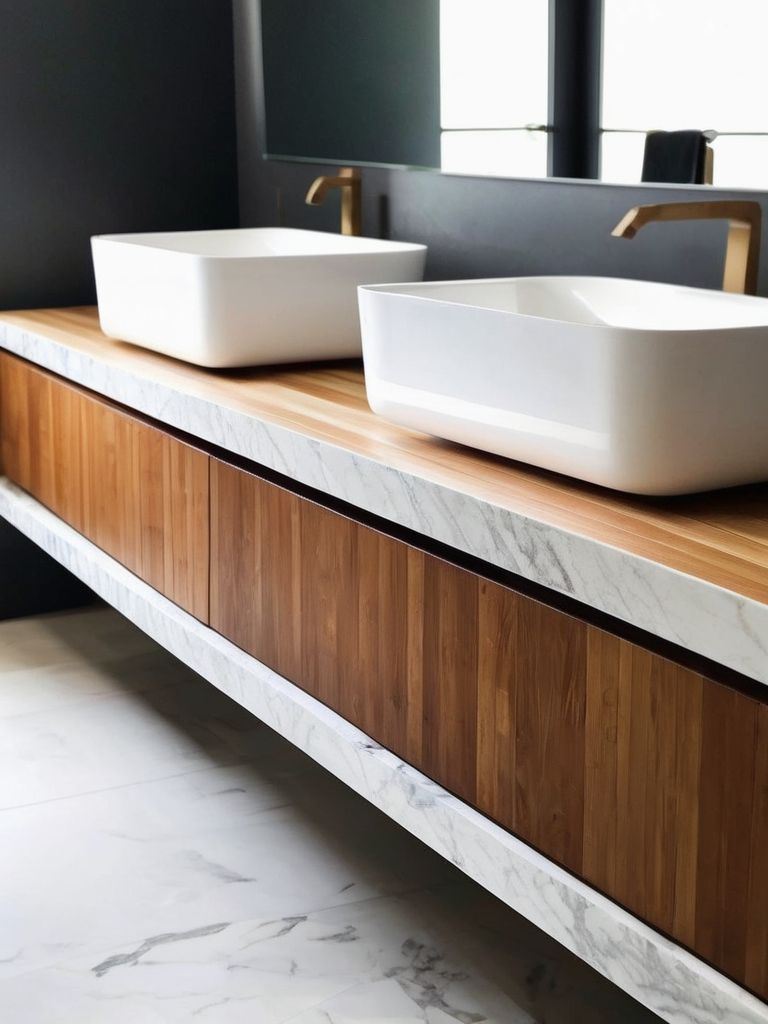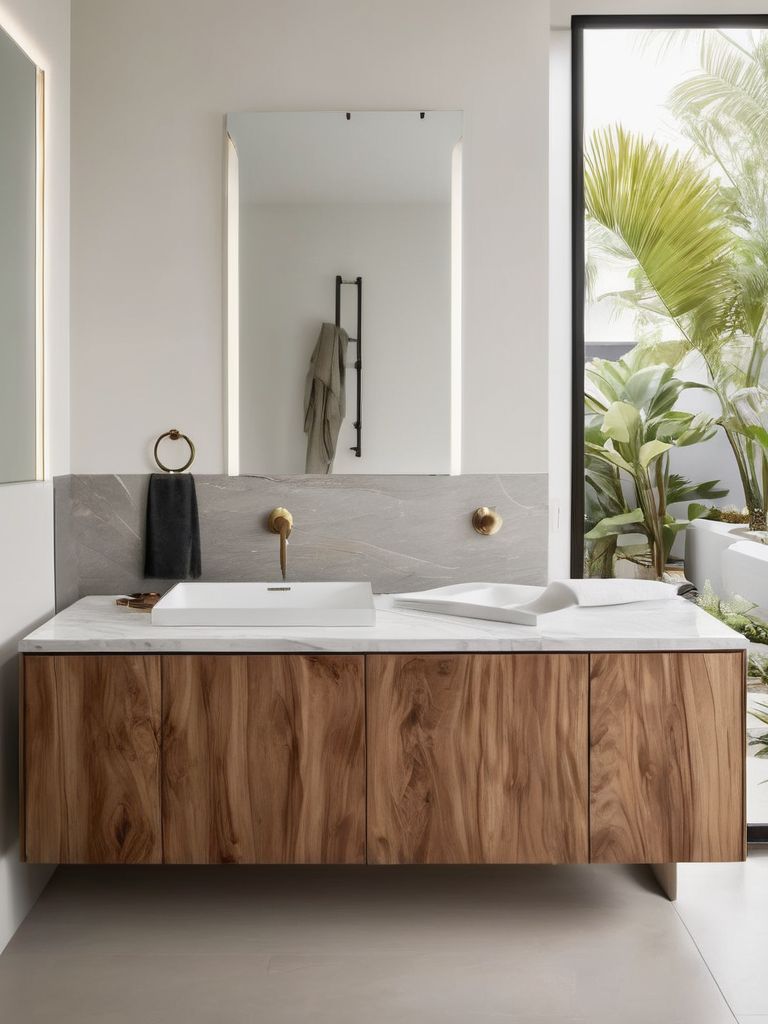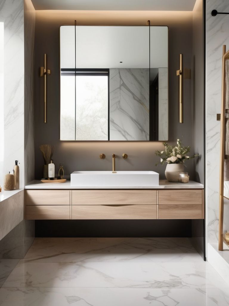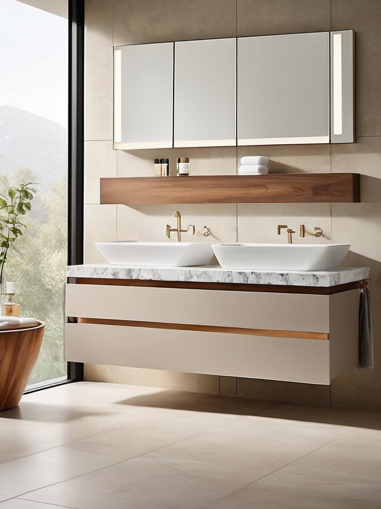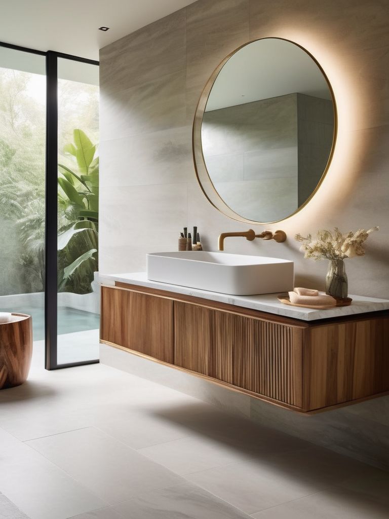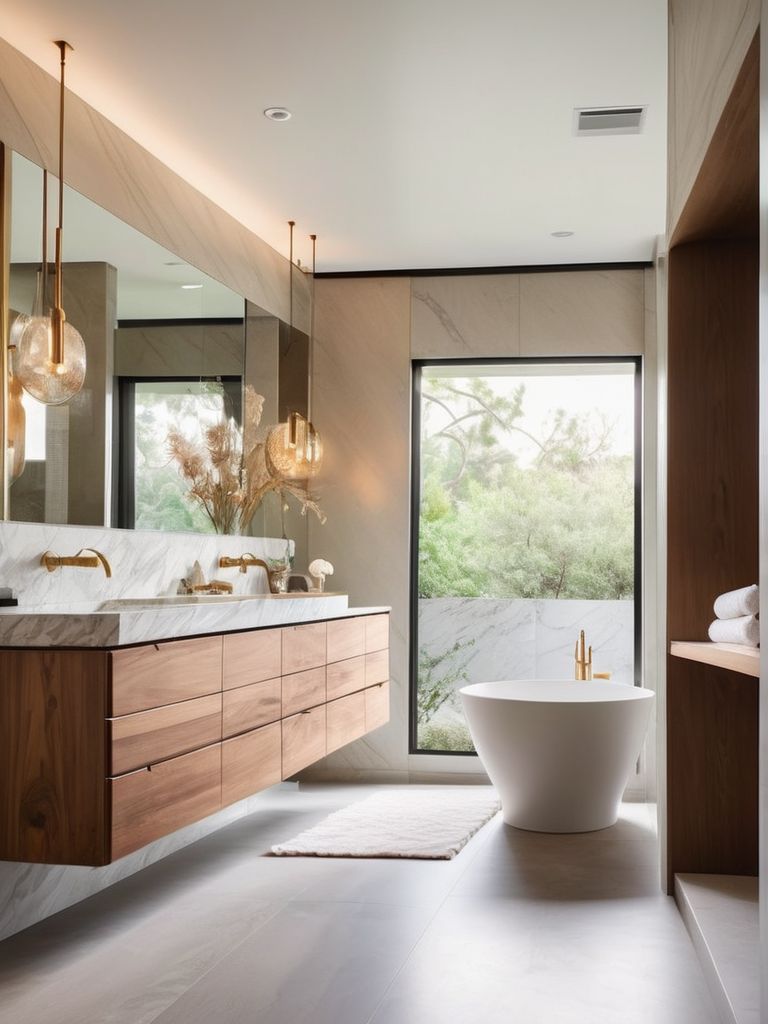 Floating vanities, Freestanding tubs, Modern fixtures, Minimalist decor, Natural tone materialsDescription