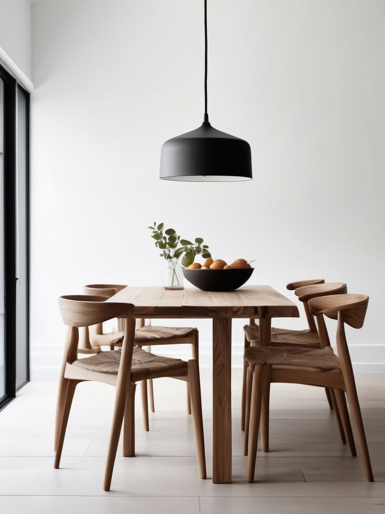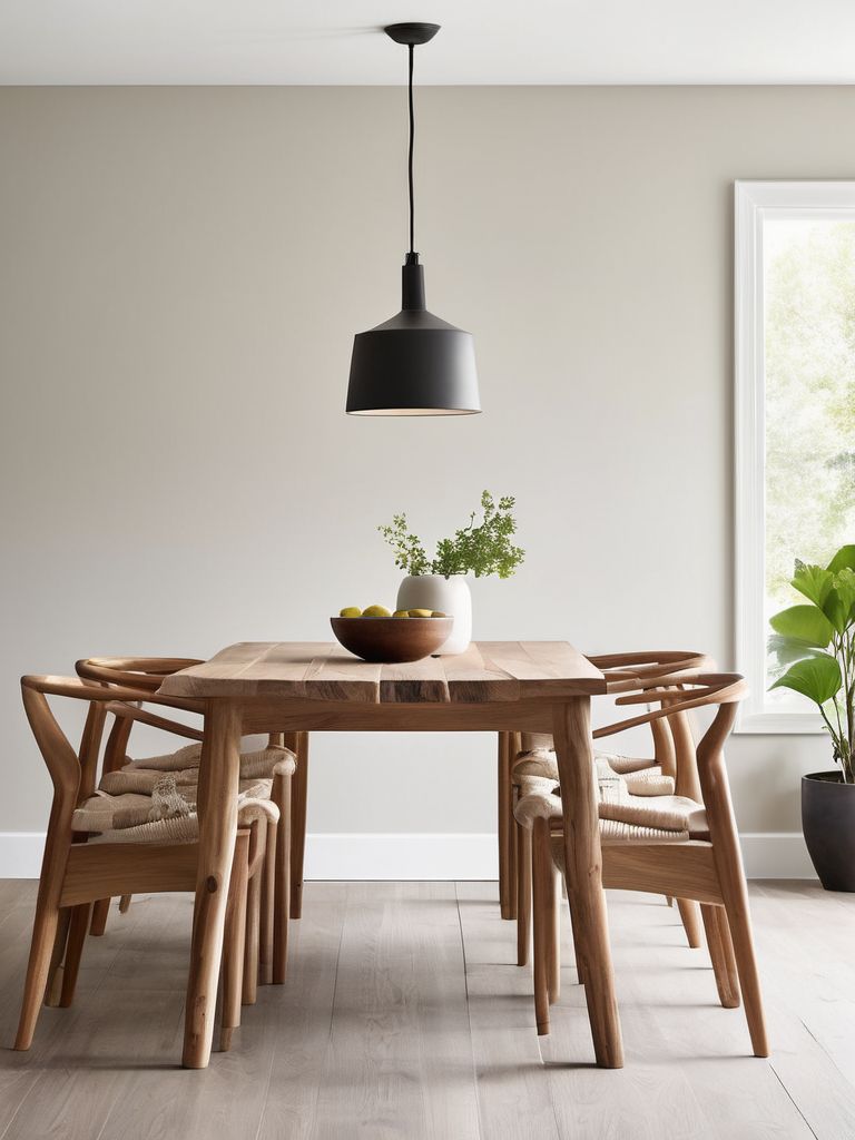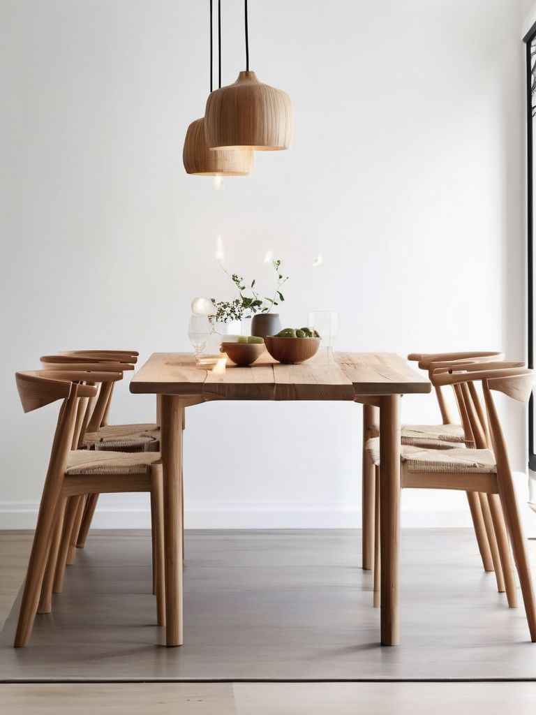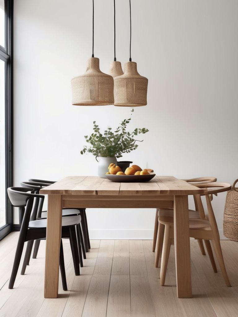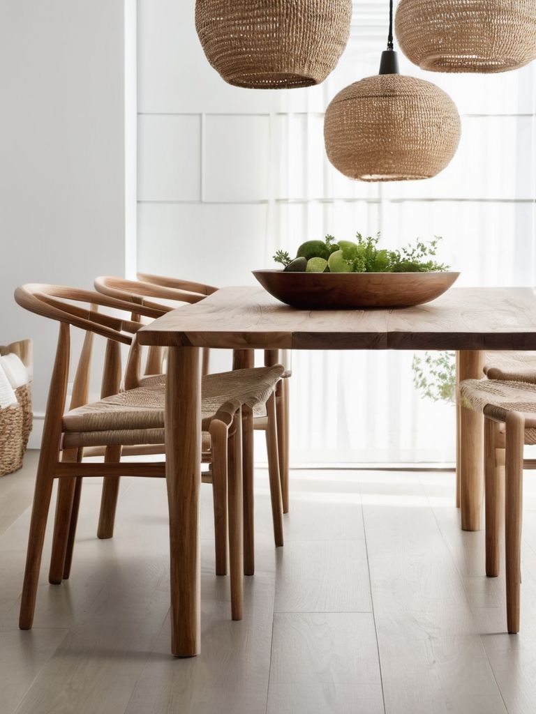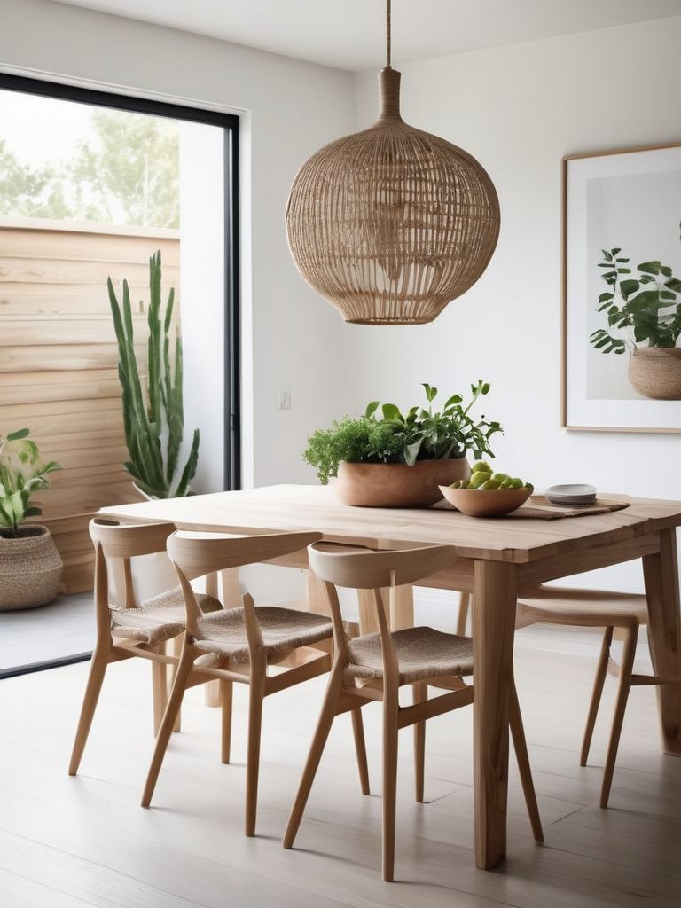 Light oak or birch dining table and chairs, Textured linen or cotton tablecloth and napkins, Neutral-toned placemats and coasters, Minimalist glassware and dinnerware, Potted plants or fresh flowers for tabletop decorDescription
