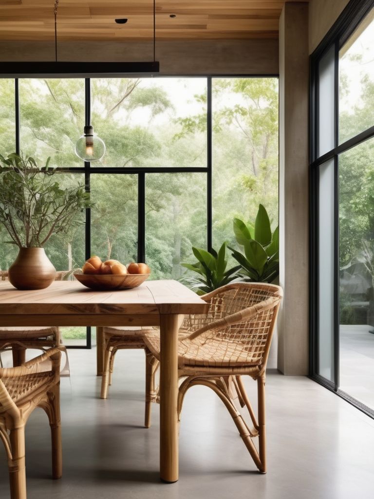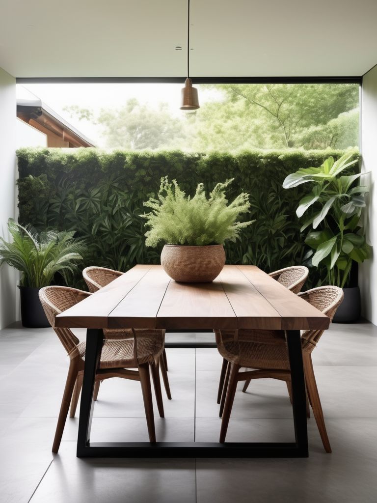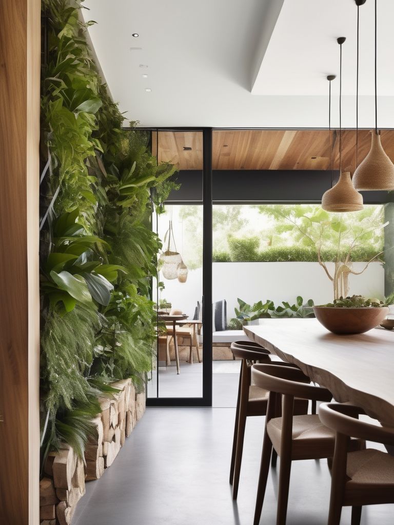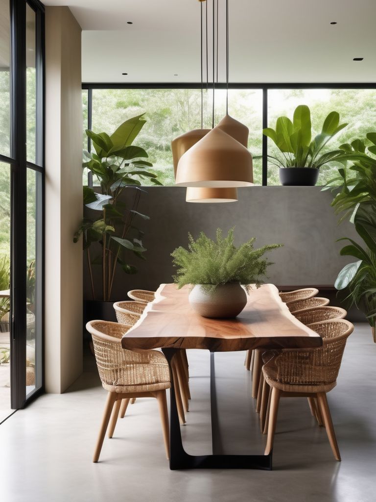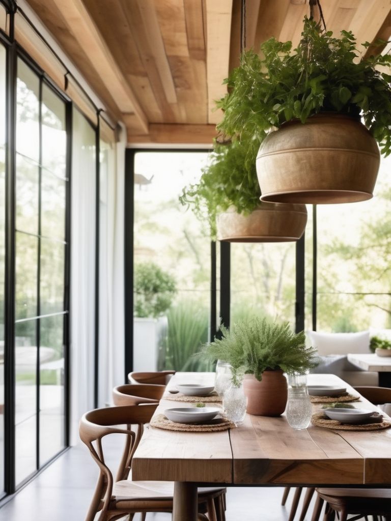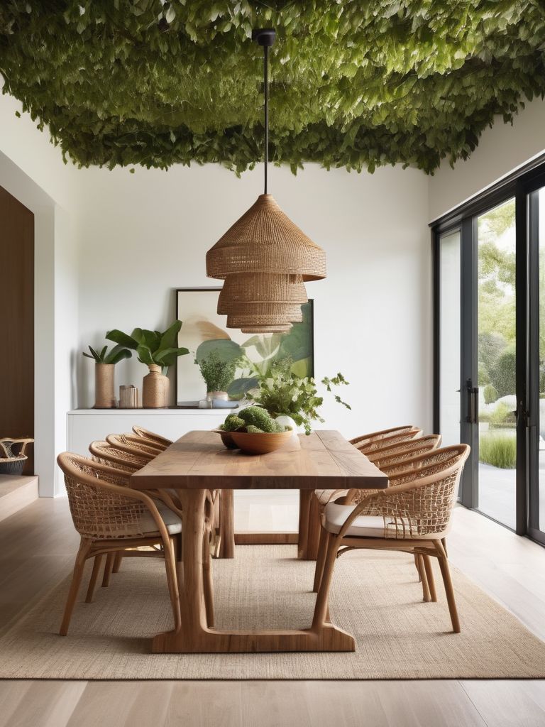 Create a seamless transition between indoor and outdoor spaces in the dining room by incorporating large windows, bi-fold doors, and skylights to allow ample natural light and airflow. Embrace a botanical theme by adding lush greenery, potted plants, and vertical gardens for a fresh and inviting atmosphere. Utilize natural materials such as wood, stone, and rattan for furniture and decor to enhance the connection with the outdoors. Consider a neutral color palette with pops of green and earthy tones to evoke a sense of tranquility and nature.