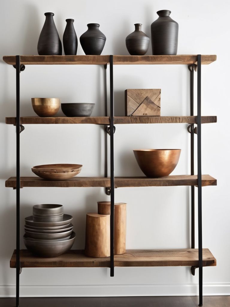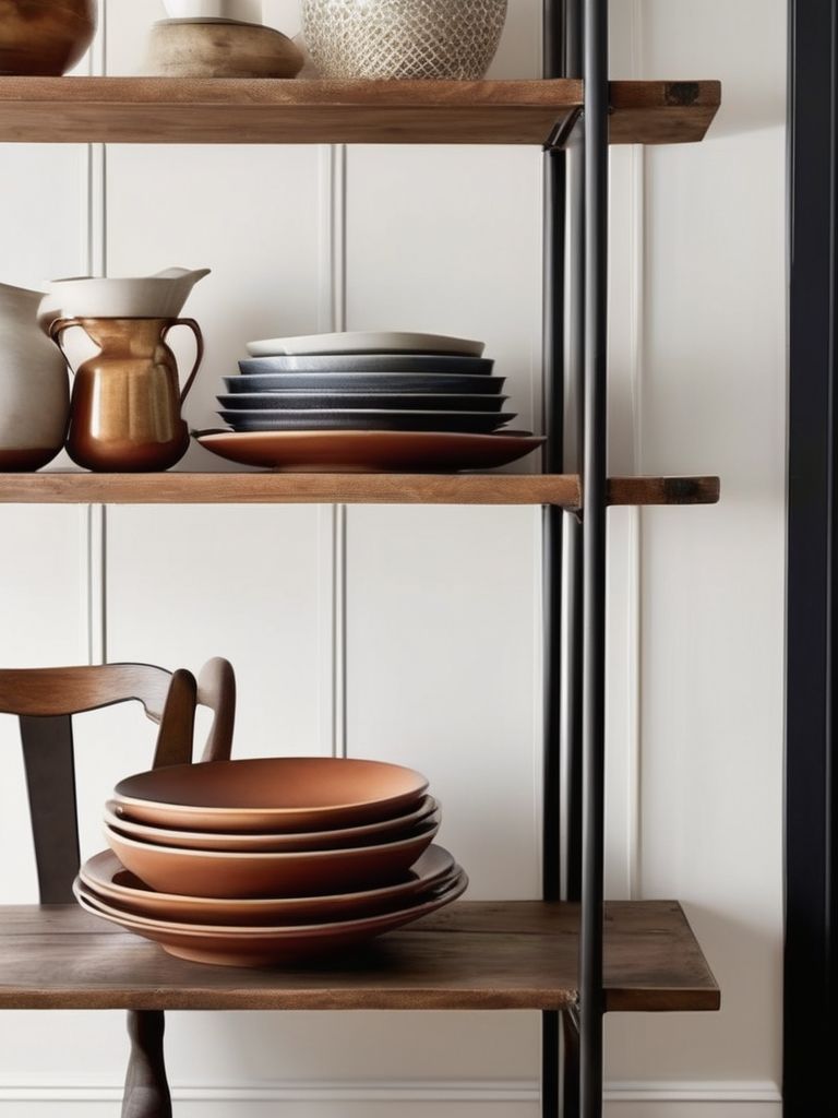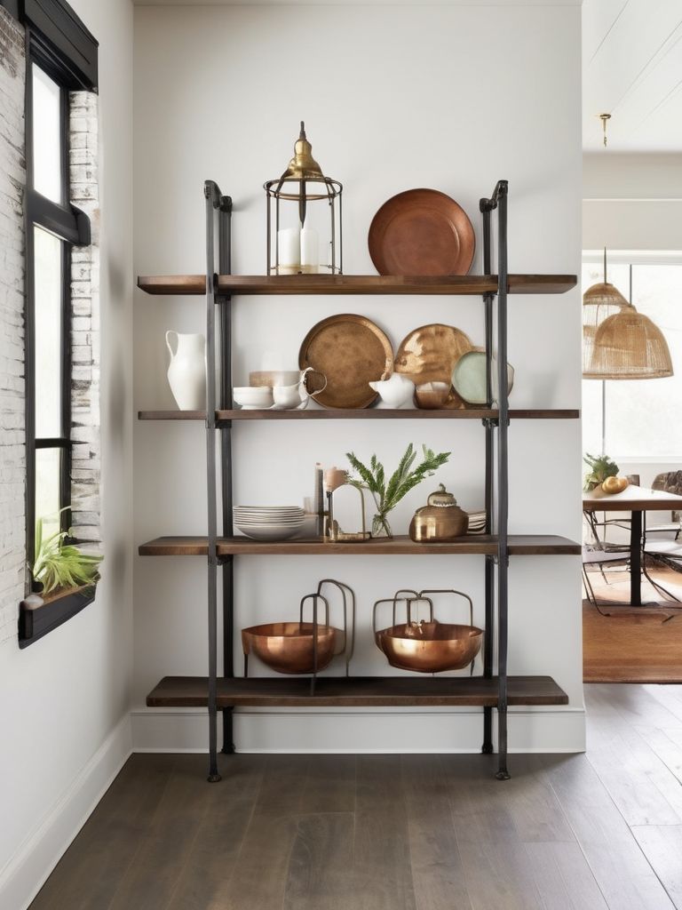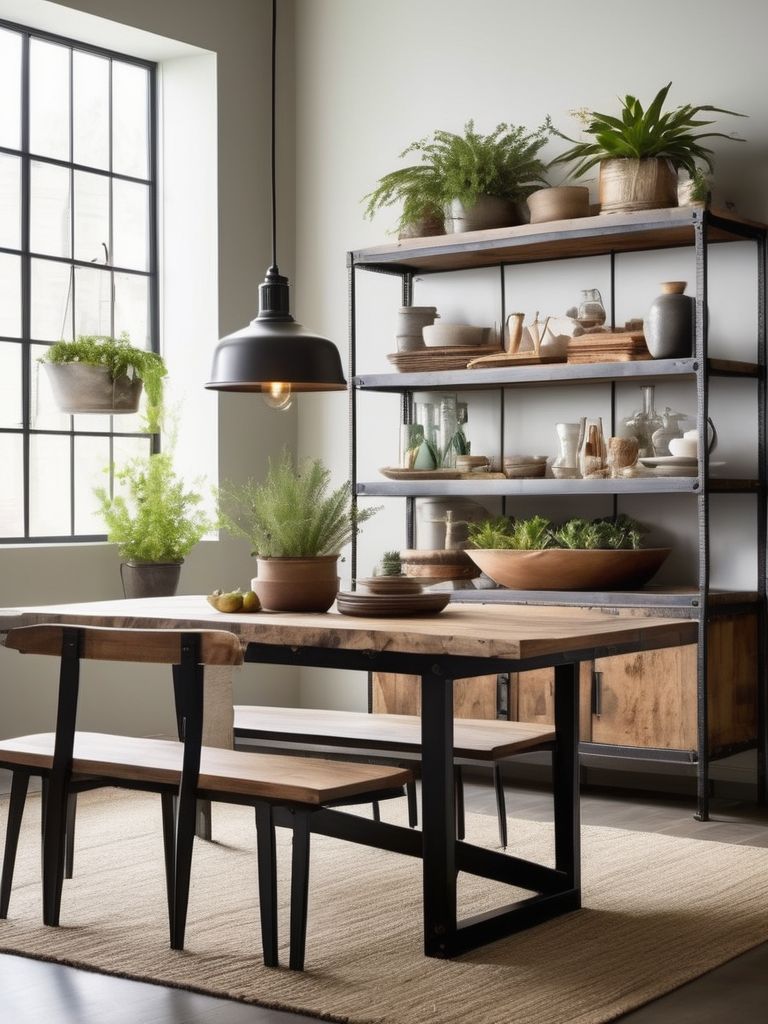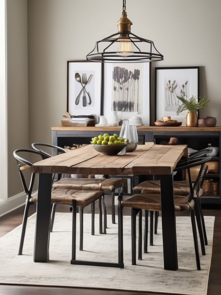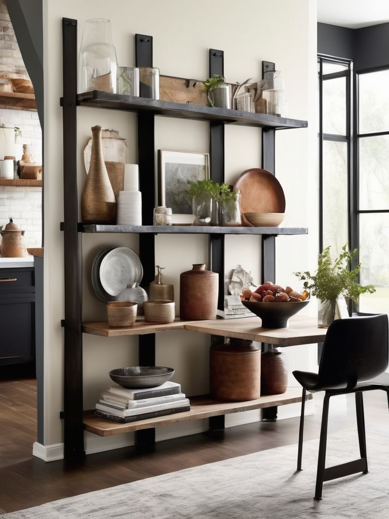 Eclectic wall art, Industrial shelving, Dining essentials, Mix of materials (metal, wood, glass), DecorDescription