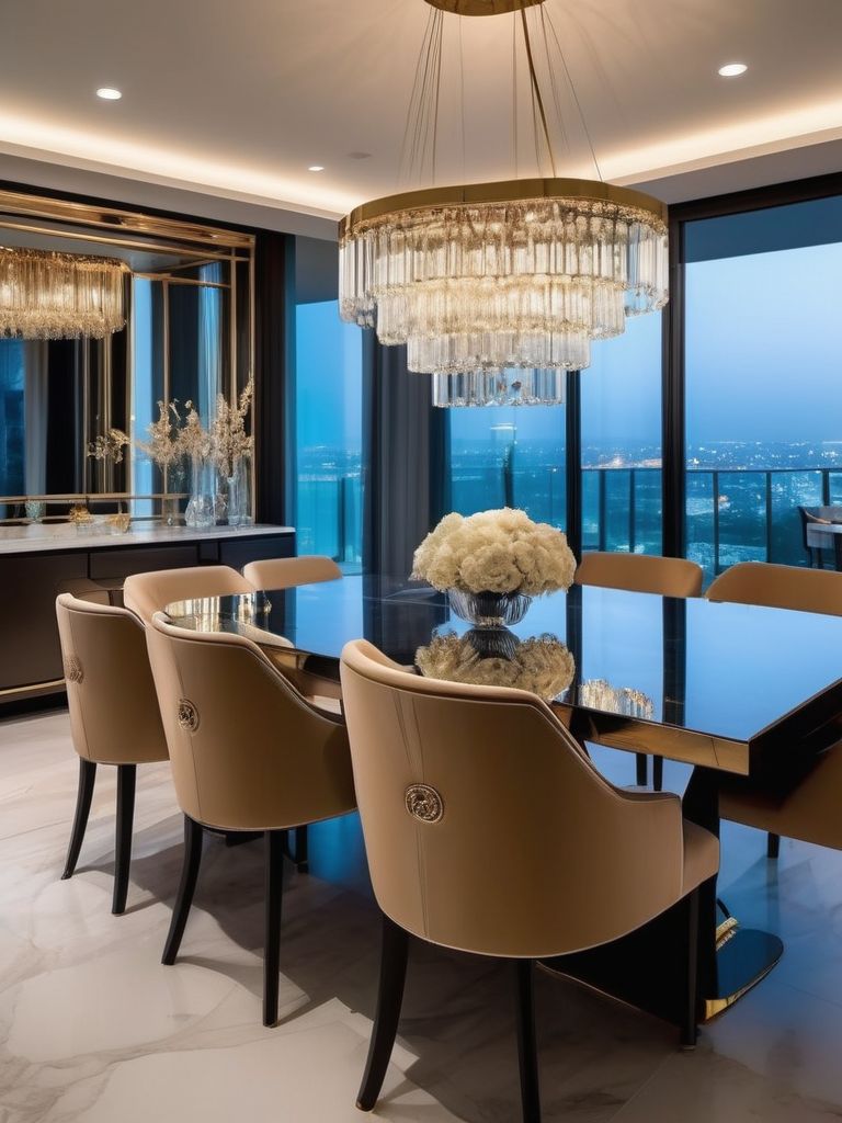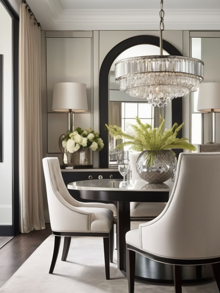 Glass chandelier, Mirrored decor, Metallic accents, Lush greenery, Dining room accessoriesDescription