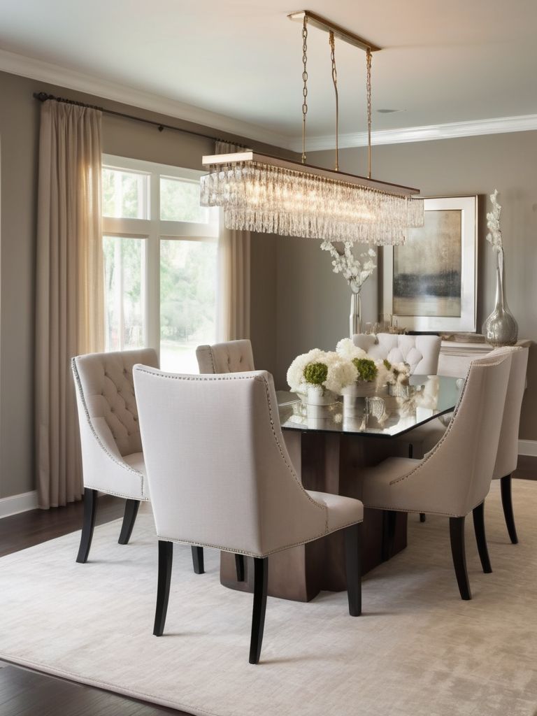 Transform your dining room into a dazzling and elegant space by incorporating glass chandeliers and mirrored decor. Create a sense of opulence and sophistication with the reflective surfaces, placing a focus on enhancing natural light and creating a heightened atmosphere. Consider mixing in metallic accents to complement the light-reflective elements, and adding lush greenery to soften the overall look. Elevate your dining experience with a radiant and luxurious design that will captivate and impress.