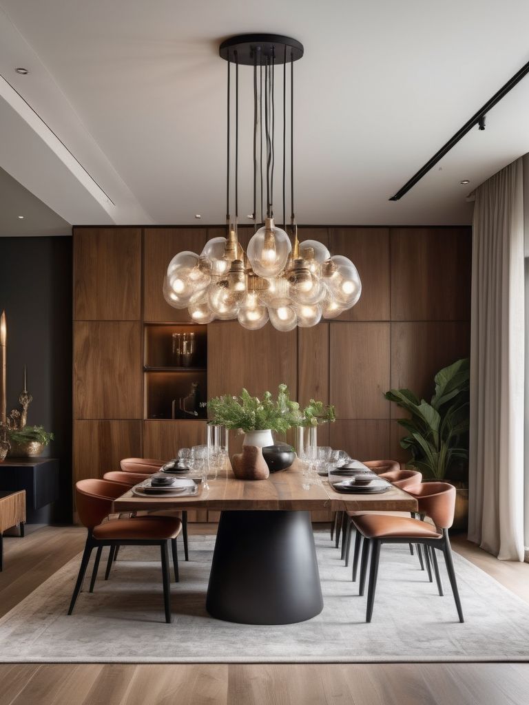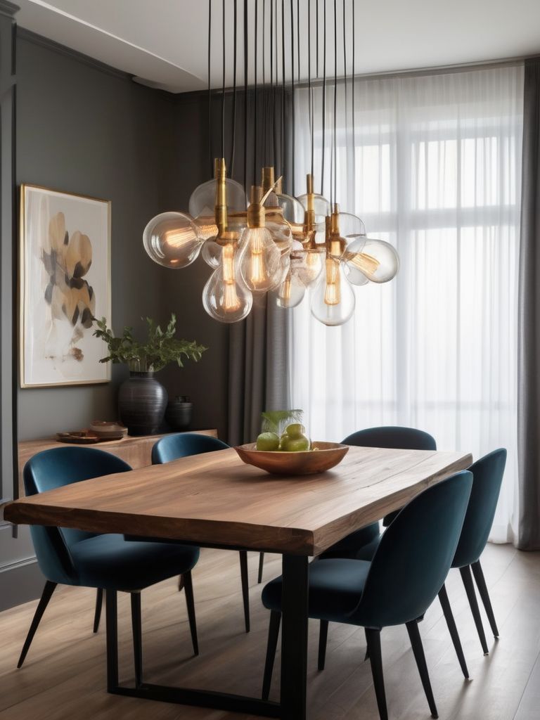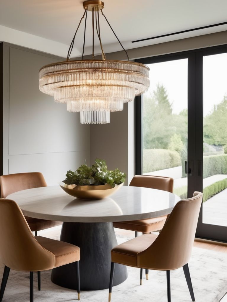Create a stunning dining room space by combining modern elegance with vintage charm. Choose a statement chandelier with sleek lines and contemporary design, to contrast with a beautifully aged wooden or metal table. Incorporate elements of both old and new to achieve a timeless and sophisticated look. Let the chandeliers illuminate the vintage tables for a perfect blend of style and character.