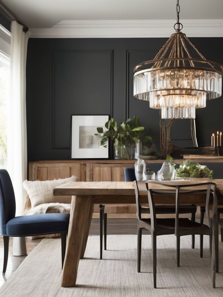 Statement chandelier, Vintage wooden table, Vintage metal table, Modern elegant dining chairs, Timeless wall decorDescription