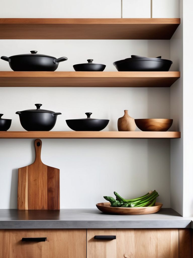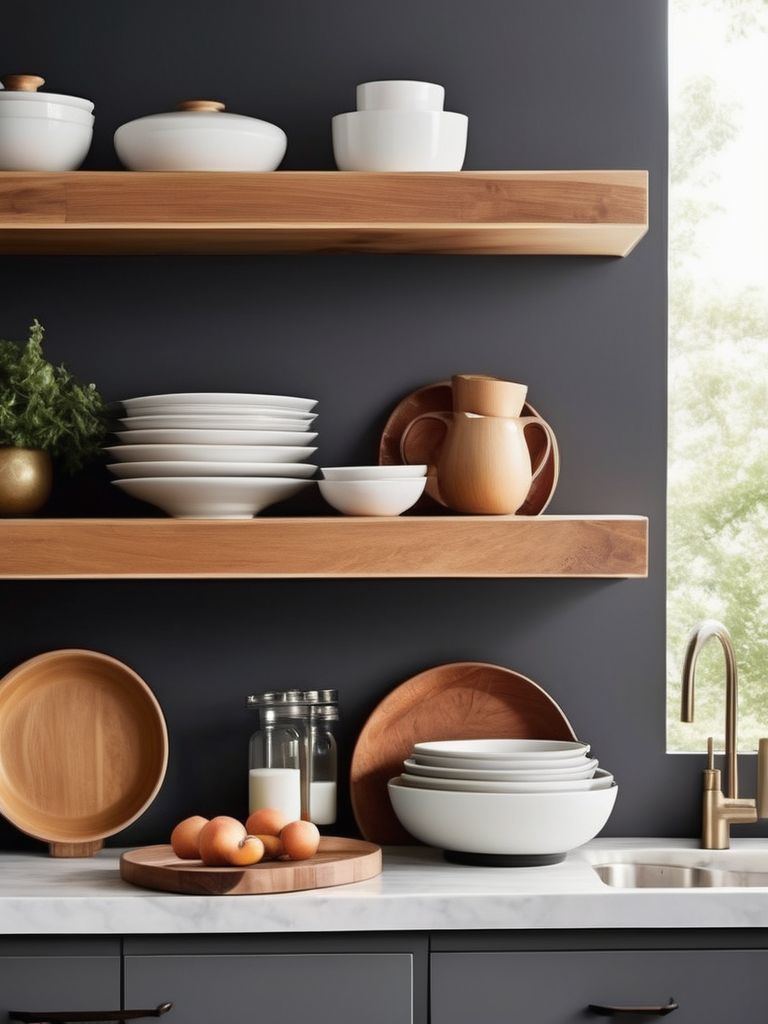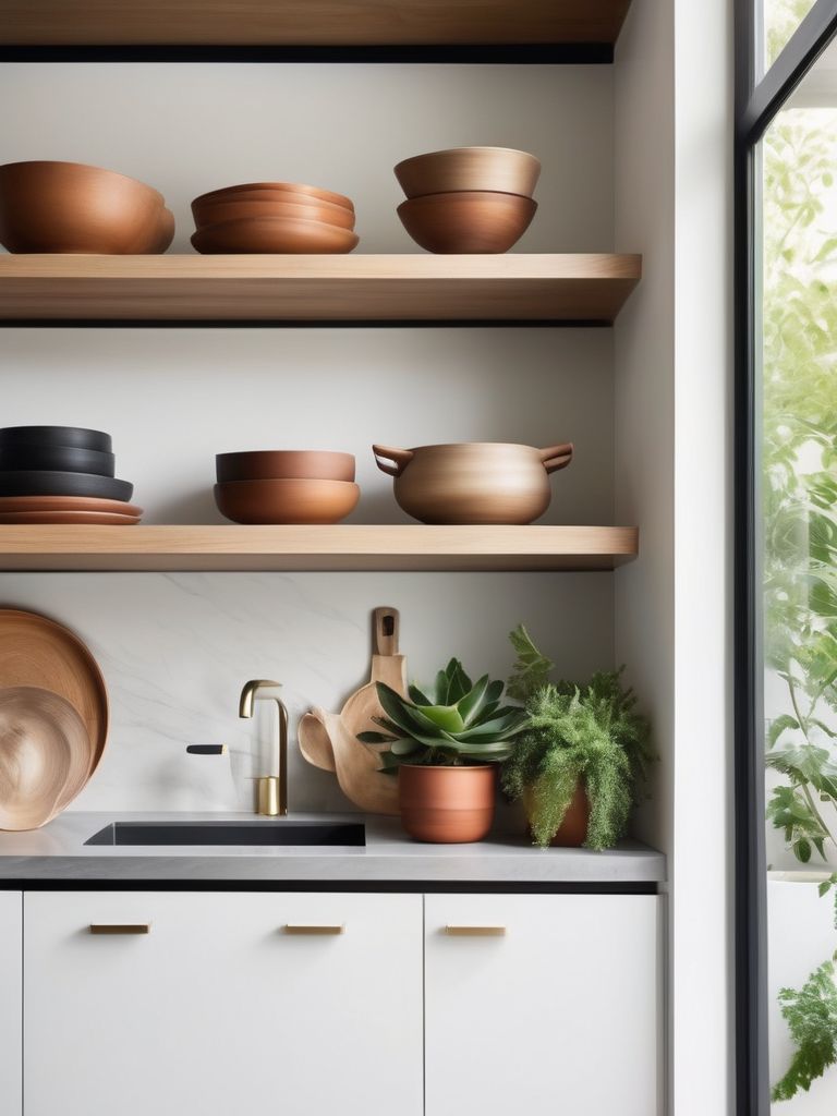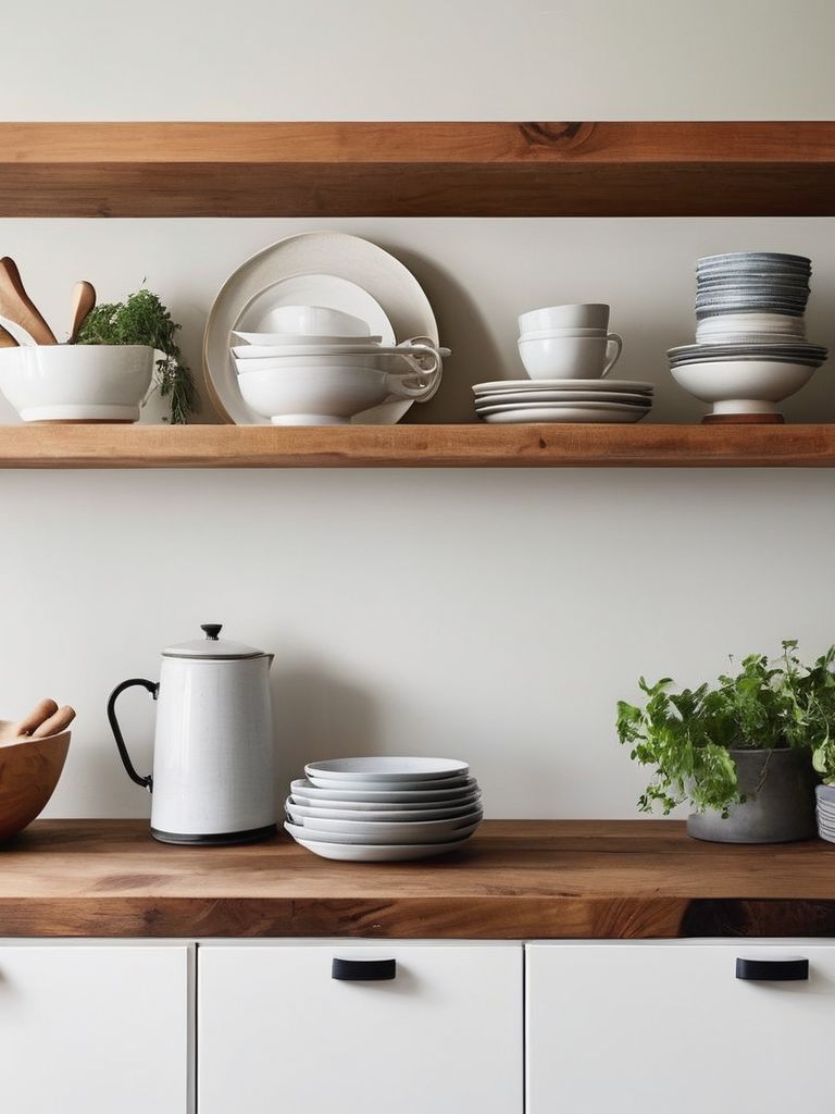Wooden floating shelves, Cookware, Dishes, Greenery, Decorative accentsDescription