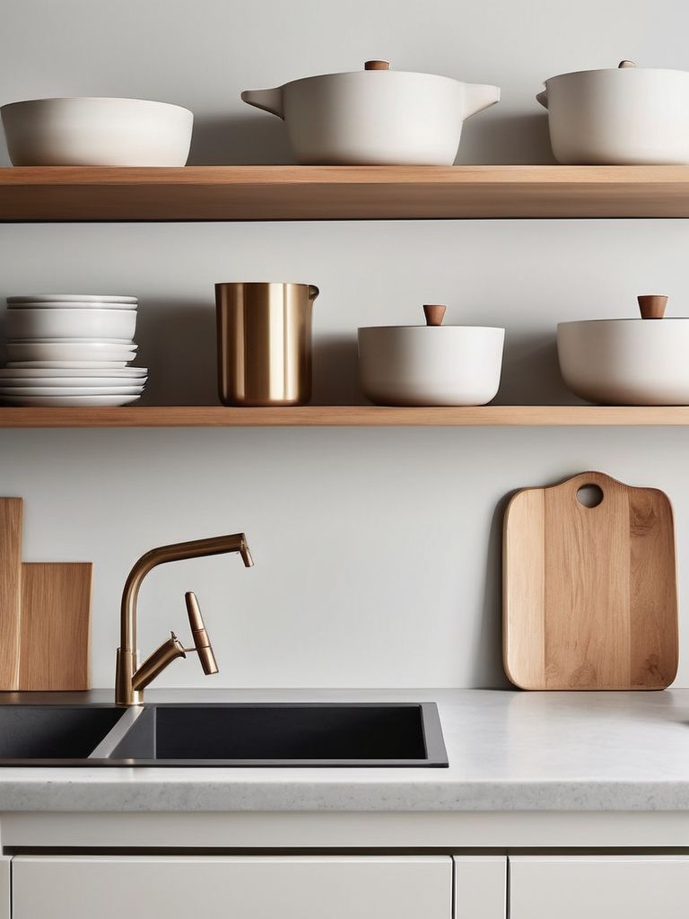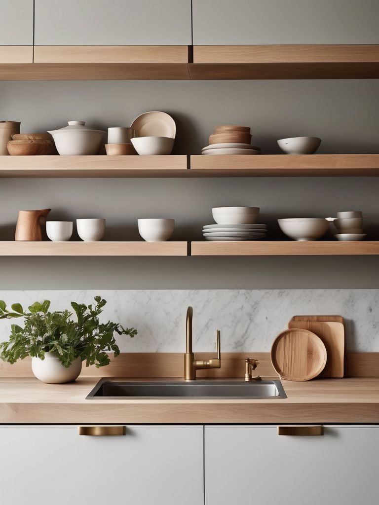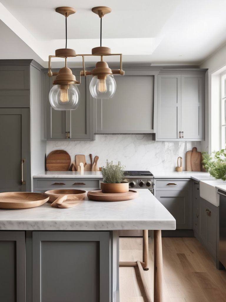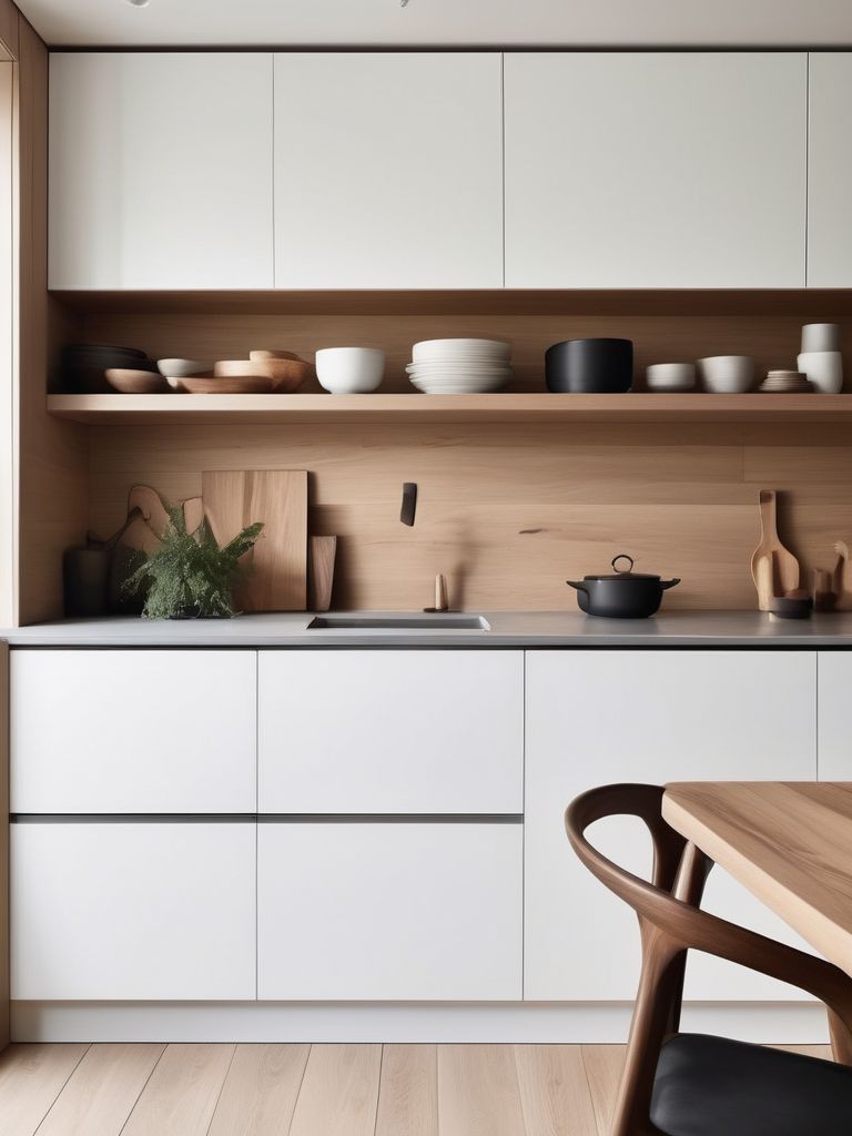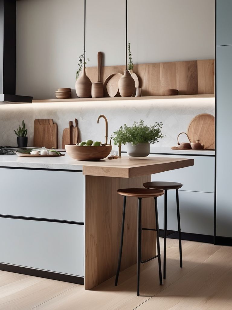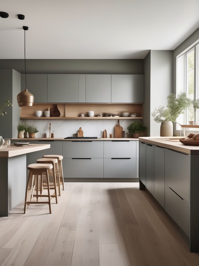 Create a modern Scandinavian-inspired kitchen with a focus on clean lines, minimalism, and functionality. Utilize muted color palettes such as soft grays, whites, and light blues to create a calming and cohesive atmosphere. Incorporate natural materials like wood and stone for an organic and timeless feel. Embrace open shelving and sleek cabinetry for a clutter-free and airy space. Let natural light be the centerpiece and consider adding small pops of color through plants or kitchen accessories for a touch of warmth.