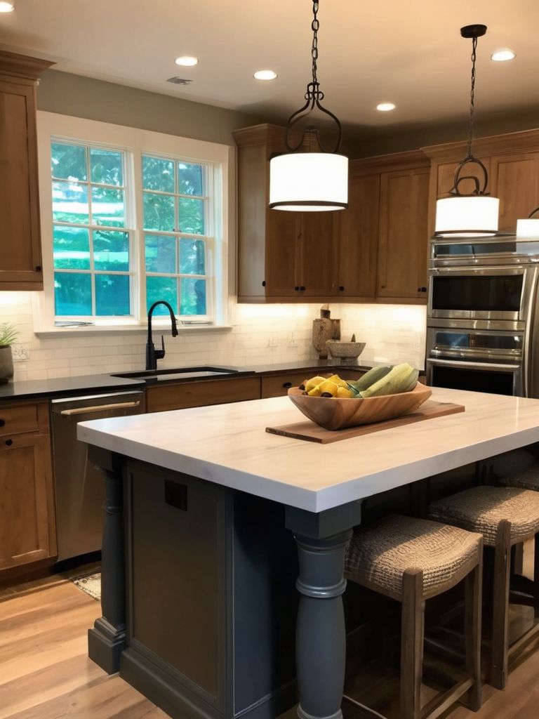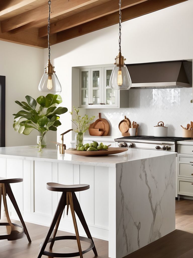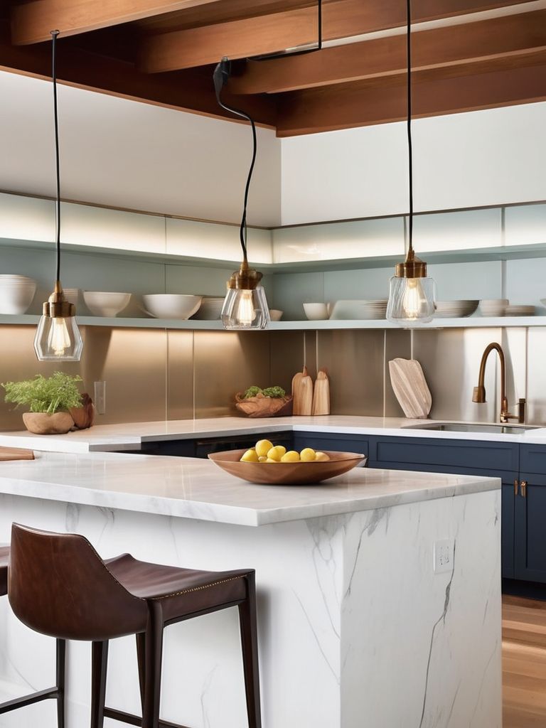 Transform your kitchen space with the addition of statement pendant lighting above the central islands for a chic and functional ambiance. Choose sleek, minimalist designs for a modern aesthetic or opt for vintage-inspired fixtures to add character and charm. Consider adjustable height options to customize the lighting and create an inviting atmosphere. Select materials like glass, metal, or bamboo to complement your kitchen's decor and elevate the overall design.