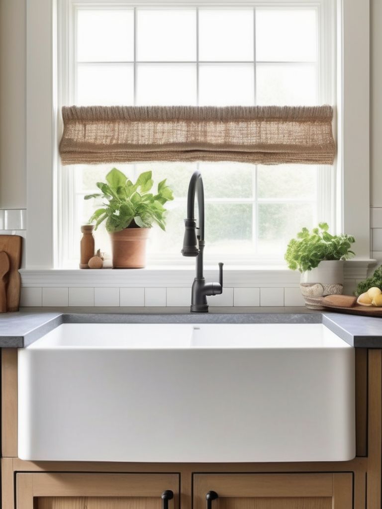 Create a Cozy and Inviting Kitchen with a Farmhouse Sink and Quaint Window Dressings
