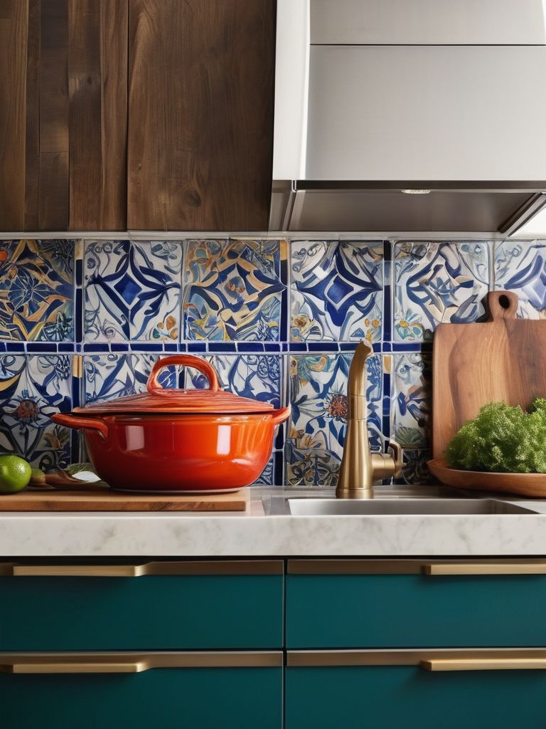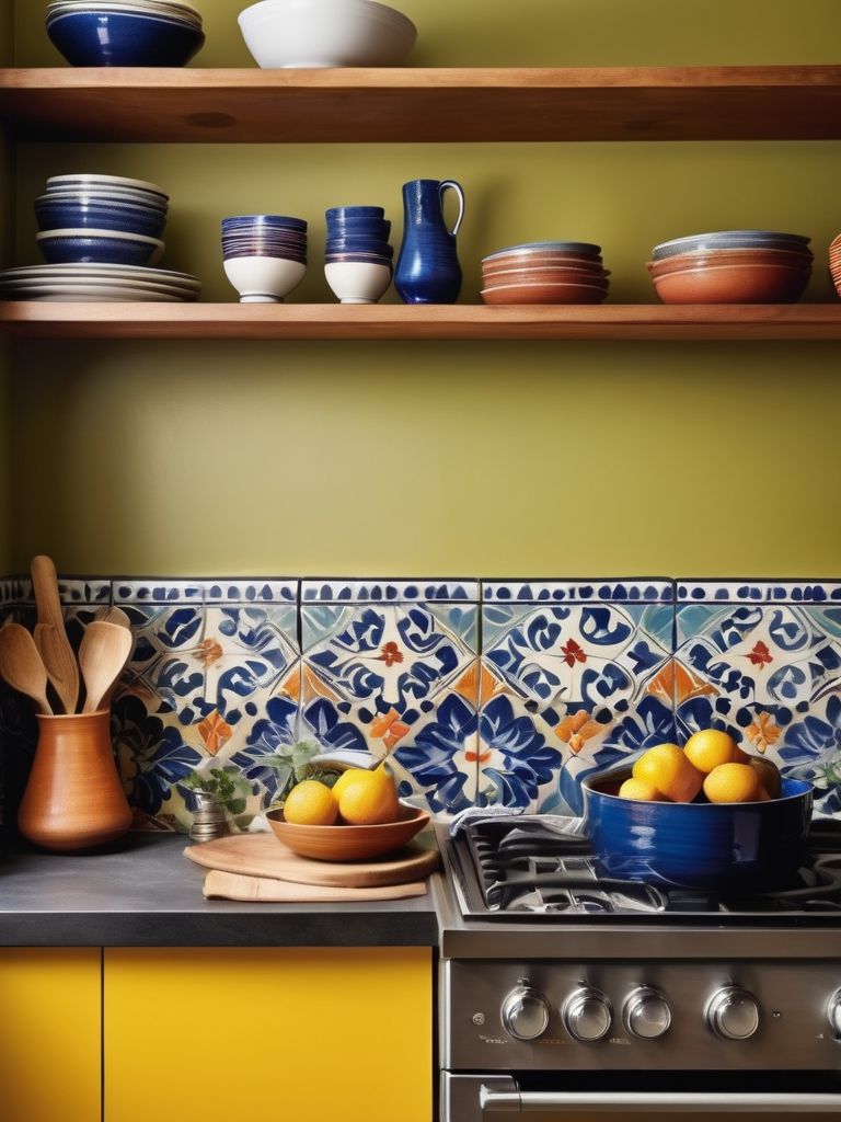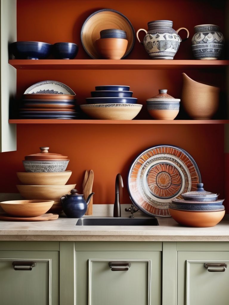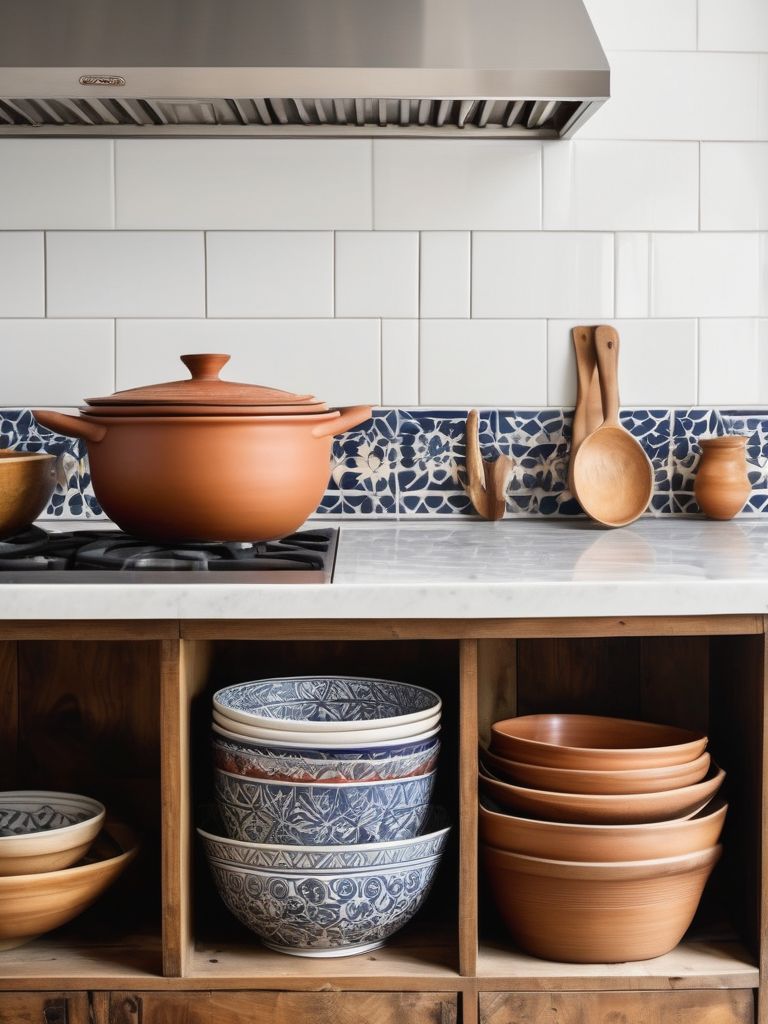 Handcrafted tiles from around the world, Vintage and modern kitchen appliances, Colorful textiles, Pottery from different cultures, Global artisan piecesDescription