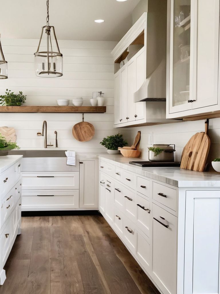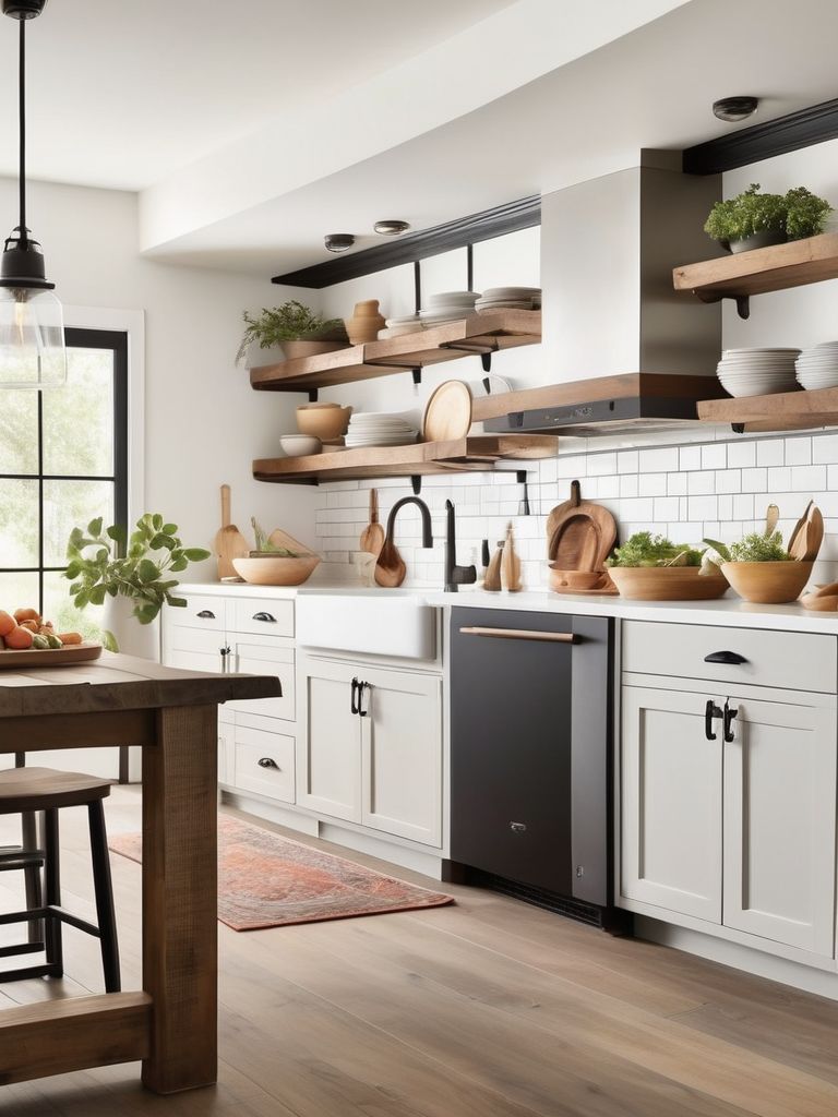Transform your kitchen into a cozy farmhouse retreat with modern elegance. Incorporate rustic elements like barnwood accents and distressed finishes, balanced with sleek stainless steel appliances and minimalist cabinetry. Consider open shelving to showcase vintage dishware and add a touch of nostalgia. Embrace the farmhouse charm with a contemporary twist, blending warmth and functionality for a stylish and inviting space.