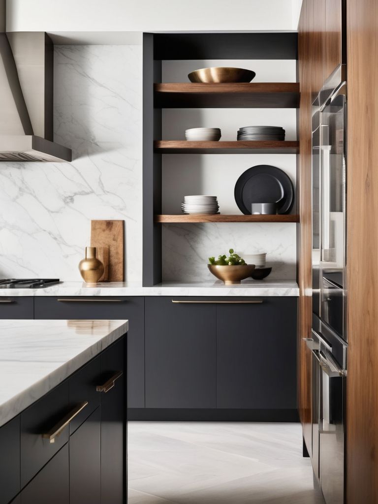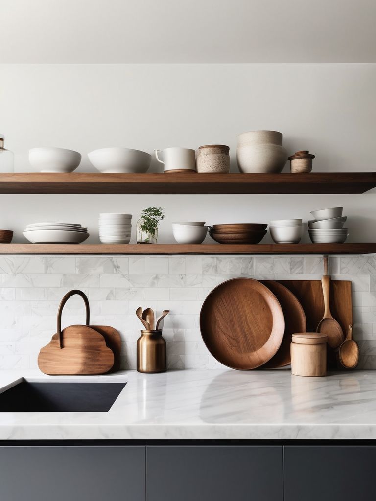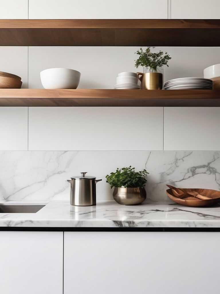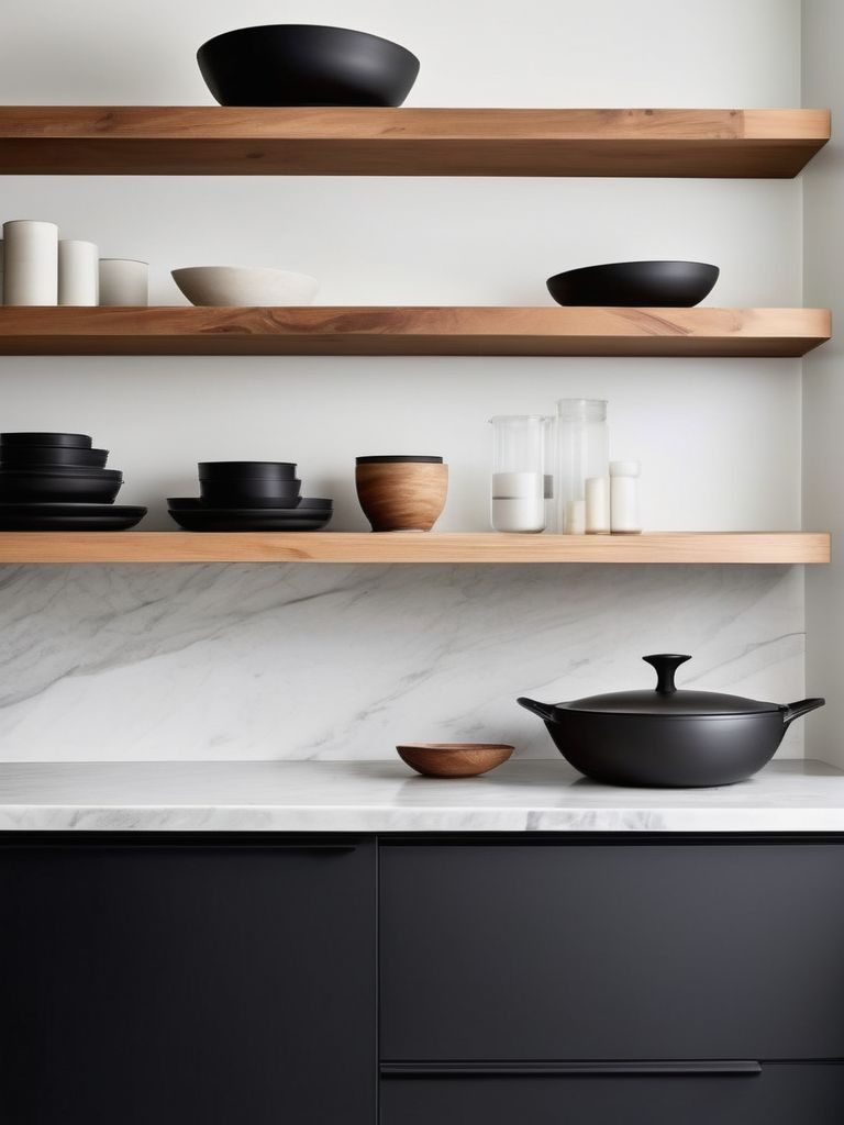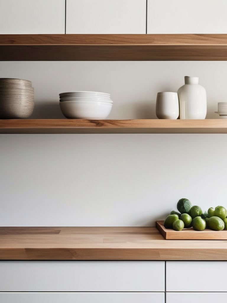 Transform your kitchen into a modern oasis with sleek, open floating shelves that achieve an airy, minimalist aesthetic. Install clean-lined, neutral-colored shelves to display your favorite cookware, plants, and decorative items. Maximize storage and maintain an uncluttered feel with smart organization solutions. Embrace simplicity and sophistication in your kitchen design with a focus on functionality and visual appeal.