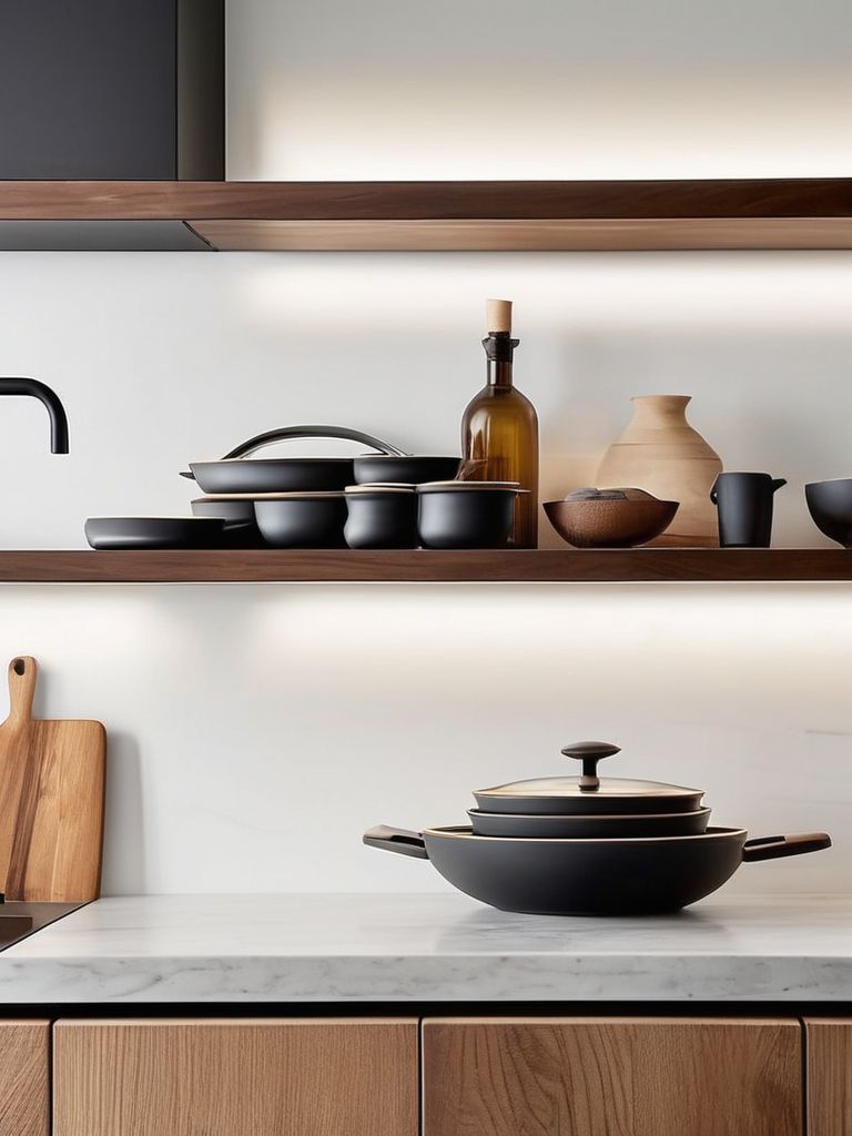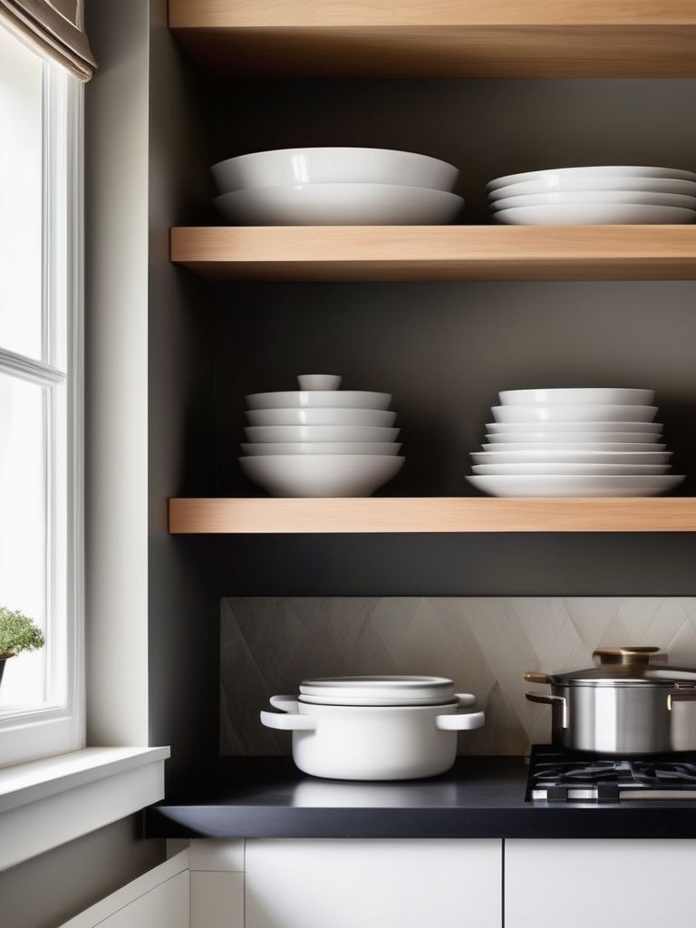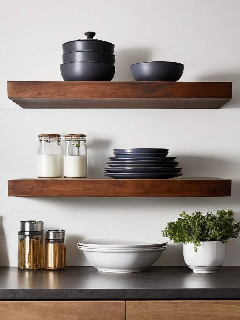 Open floating shelves, Clean-lined, neutral-colored shelves, Cookware, Plants, Smart organization solutionsDescription