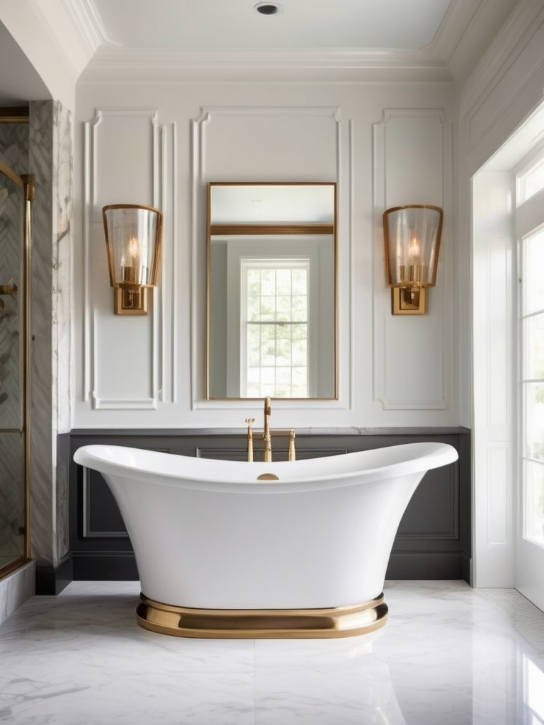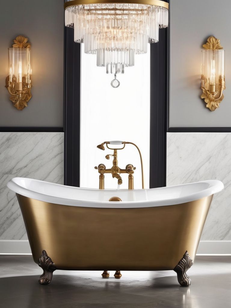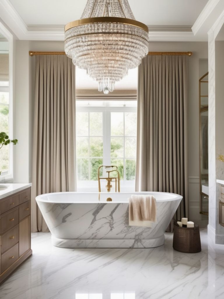 Freestanding tub, Clawfoot tub, Modern sculptural tub, Statement chandelier, Plush towelsDescription